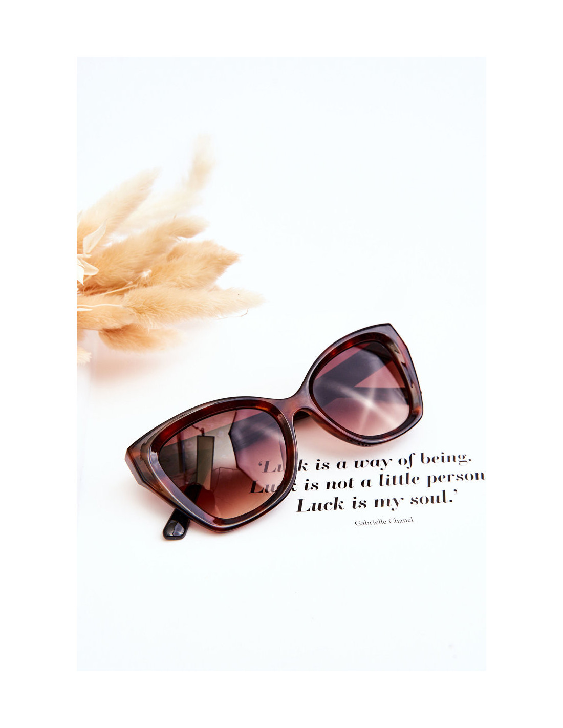 Madingi moteriški akiniai pagaminti iš plastiko. Jie turi užrašus ant šventyklų. Katės akies stiliaus modelis puikiai tiks prie įvairių stilizacijų. Informacija iš gamintojo: UV apsauga, 3 kategorija.