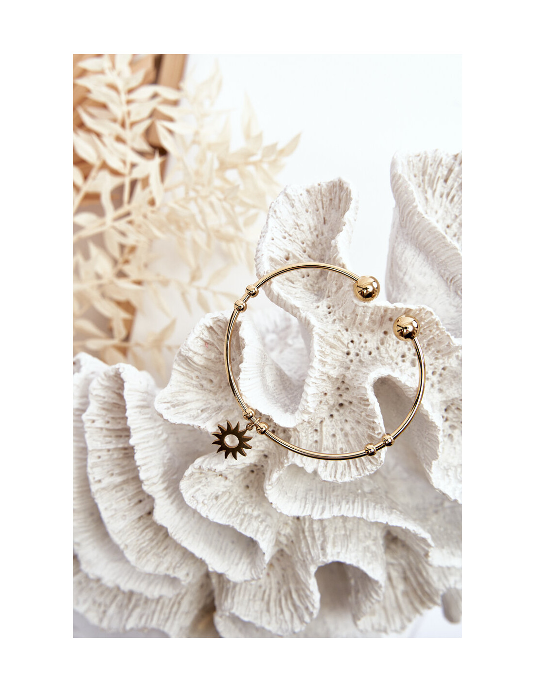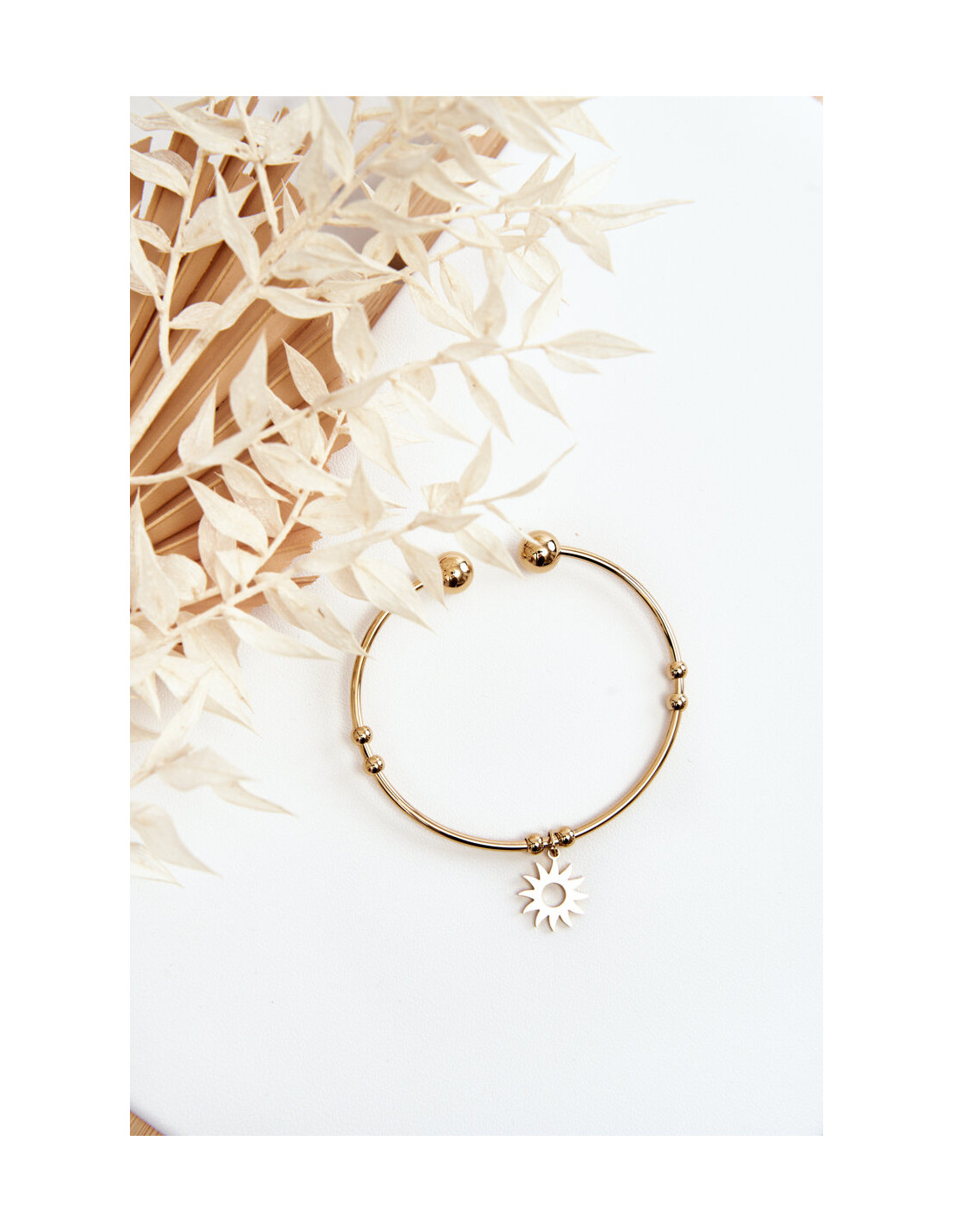 Elegantiška moteriška apyrankė – MUST HAVE kiekvienai madingus aksesuarus vertinančiai moteriai! Apyrankė pagaminta iš nerūdijančio plieno. Tai prislysta. Be to, jis dekoruotas rutuliais gale ir viduryje. Apyrankė taip pat praturtinta pakabuku su motyvu.