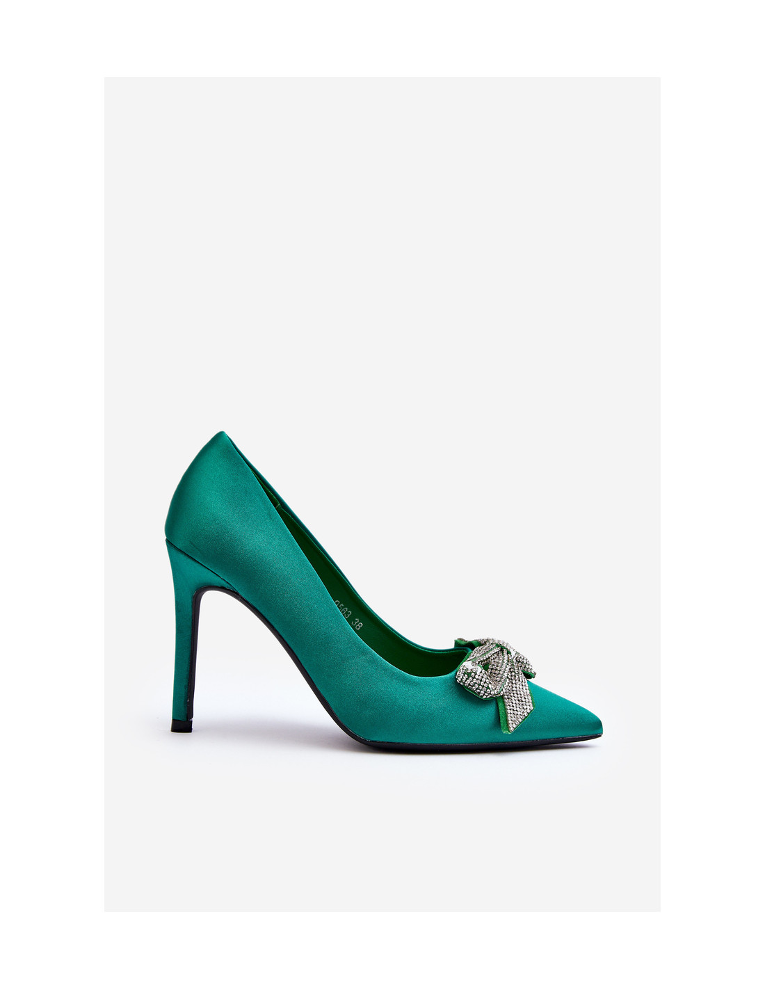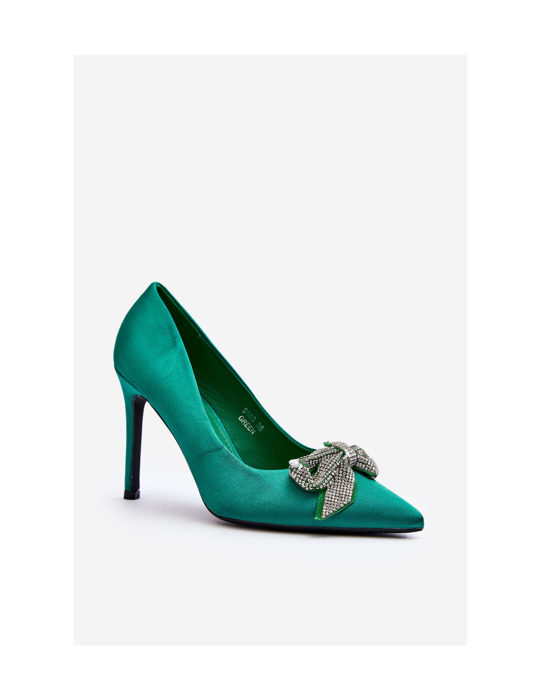 Elegantiški aukštakulniai pasiūti iš satiną imituojančios tekstilės medžiagos. Priekyje yra dekoratyvinis lankelis su blizgančiais kalnų krištolais. Smailūs pirštai optiškai lieknins kojas. Minkštas eko odos įdėklas užtikrina komfortą naudojimo metu. Šis modelis suteiks žavesio jūsų stiliui! Renkantis dydį, vadovaukitės dydžių lentele.