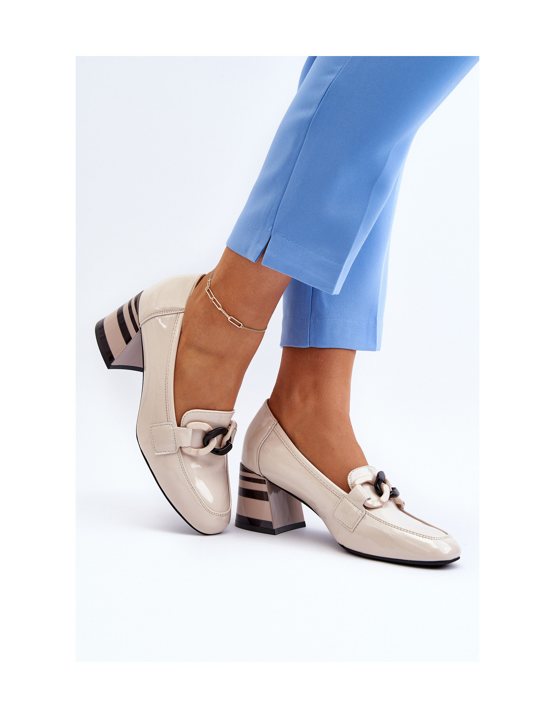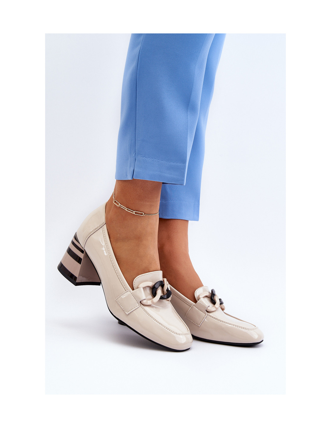 Moteriškos aukštakulniai iš natūralios odos. Jų žemas kulnas suteikia stabilumo, todėl yra puikus pasirinkimas tiek darbui, tiek oficialioms šeimos progoms. Papildomas šių batų privalumas – viršutinės dalies priekyje esanti grandinėlės puošyba, kuri suteikia jiems subtilų ir elegantišką akcentą. Kulno skaitiklis buvo papildomai sutvirtintas, todėl geriau palaiko pėdą. Be to, šių batų kulnas yra standesnis. Renkantis dydį, vadovaukitės dydžių lentele.