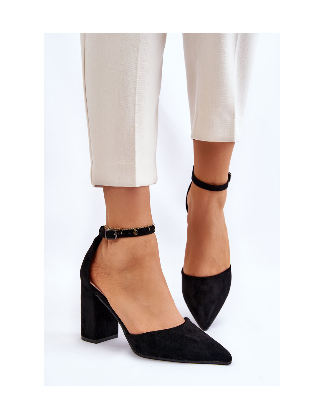 Klasikiniai smailių pirštų aukštakulniai yra pagaminti iš ekologiškos zomšos. Aplink kulkšnį užsegama sagtimi su reguliuojamu dirželiu. Minkštas eko odos vidpadis užtikrina aukštą naudojimo komfortą. Aukštakulniai buvo nustatyti ant blokinio kulno. Jos puikiai derės prie suknelių, elegantiškų kelnių ar džinsų. Renkantis dydį, vadovaukitės dydžių lentele