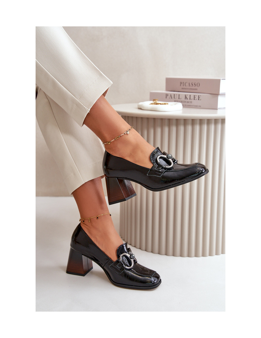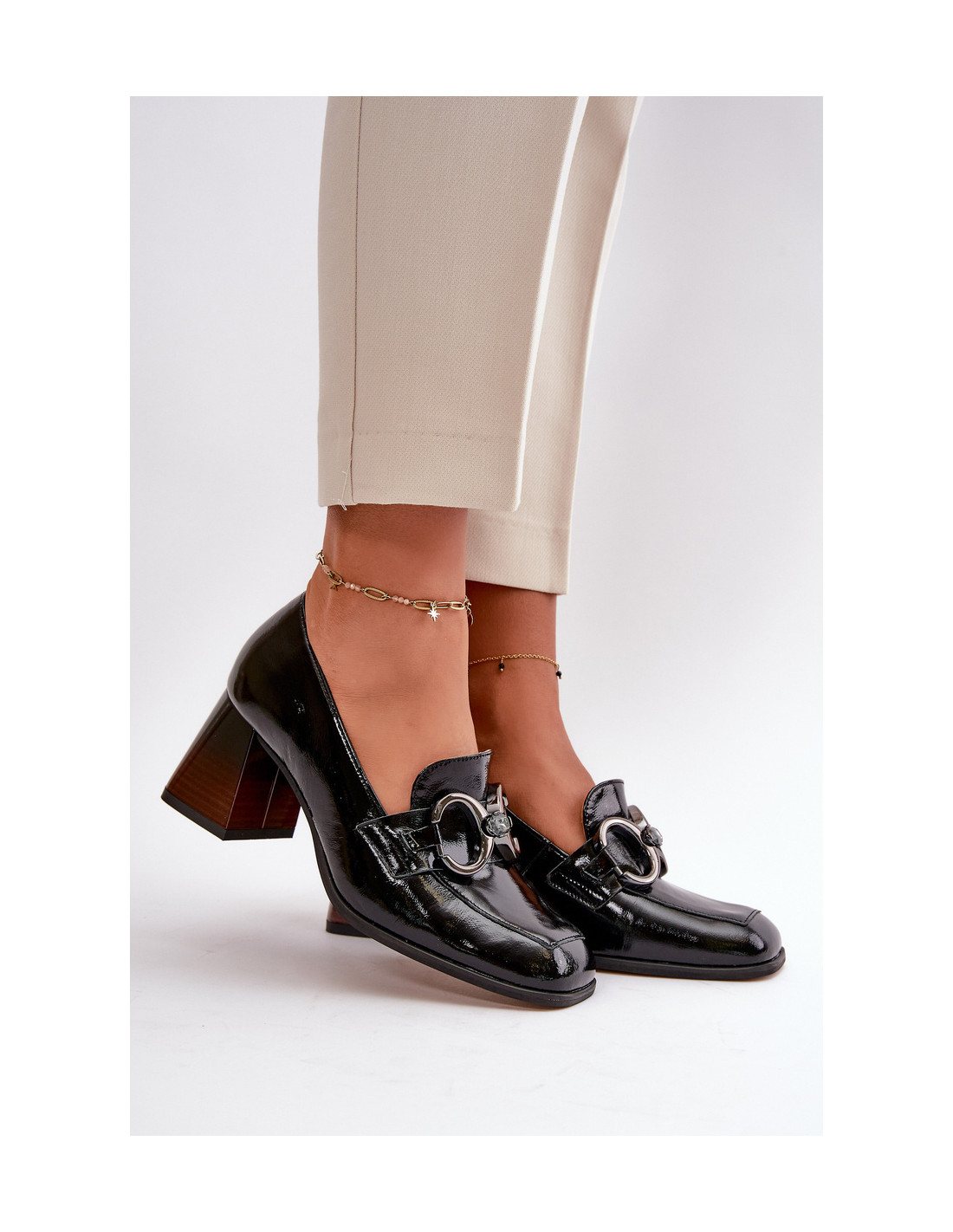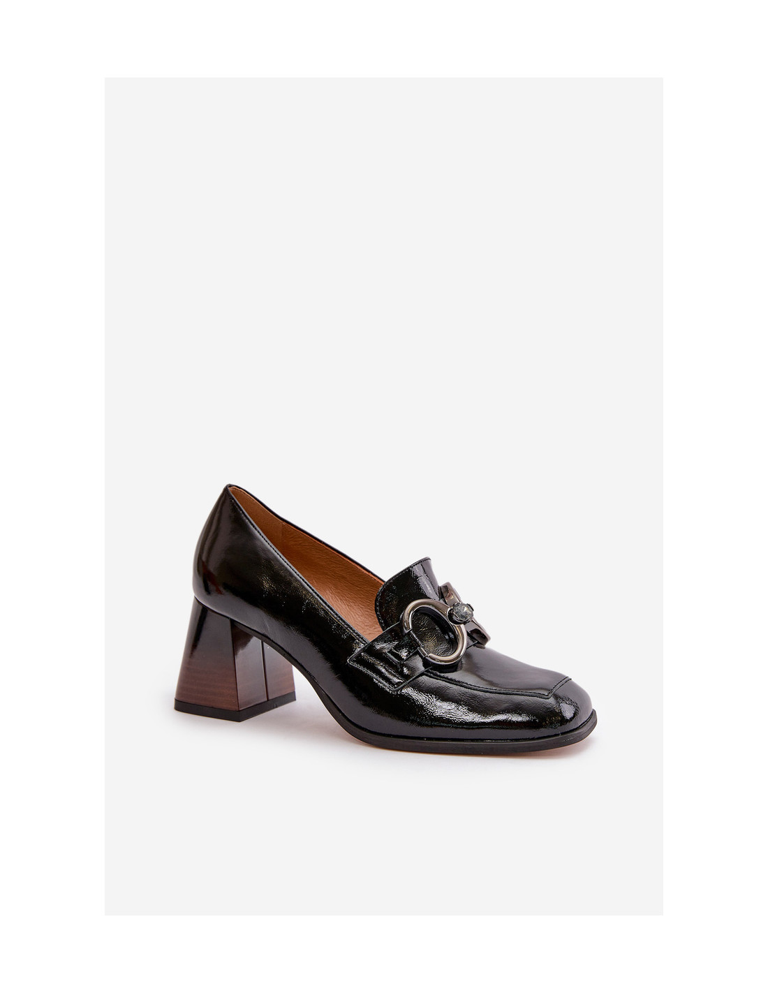 Moteriškos aukštakulniai iš natūralios odos. Jie turi blokinį kulną, kuris šiek tiek siaurėja į viršų. Kvadratiniai kojų pirštai suteikia visam daiktui šiuolaikišką išvaizdą. Priekyje yra diržas su puošmena. Šie aukštakulniai puikiai tiks tiek iškilmingoms progoms, tiek kasdieniškesnėms progoms, derindami komfortą ir eleganciją. Renkantis dydį, vadovaukitės dydžių lentele.