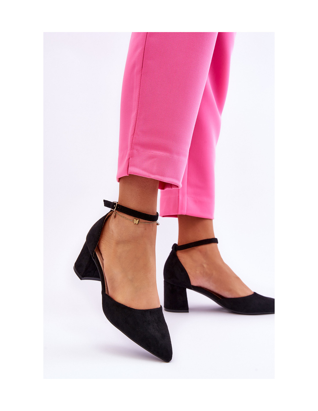 Madingos moteriškos aukštakulniai iš malonaus liesti ekologiškos zomšos. Smailus pirštas ir blokinis kulnas optiškai suplonins kojas. Be to, batai turi standintą kulną. Aukštakulniai turi reguliuojamą dirželį su sagtimi. Minkštas eko odos vidpadis užtikrina patogų avalynės naudojimą. Renkantis dydį, vadovaukitės dydžių lentele.