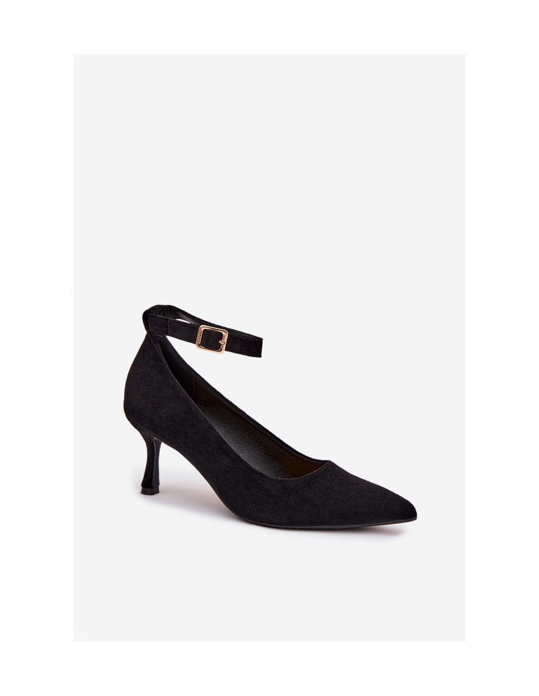 Moteriški bateliai – stiletiniai aukštakulniai, pasiūti iš minkštos dirbtinės zomšos. Šis modelis pasižymi klasikiniu dizainu su smailia nosele, kuri vizualiai pailgina kojas ir suteikia siluetui lengvumo. Šie bateliai, užsegami aplink kulkšnį reguliuojamu sagties dirželiu, gražiai paryškina pėdą, kartu užtikrindami stabilumą ir komfortą. Šie bateliai puikiai tinka tiek vakariniam įvaizdžiui, tiek elegantiškiems kasdieniams ansambliams.