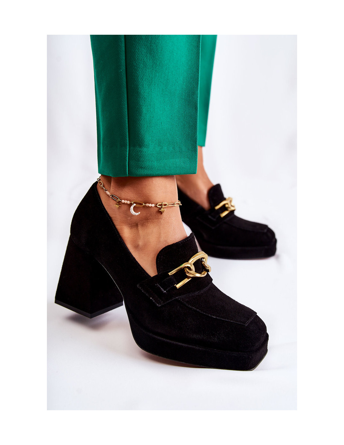 Elegantiškos moteriškos aukštakulniai yra pagamintos iš aukštos kokybės natūralios zomšos. Jų priekyje yra grandinėlės papuošalas. Minkštas vidpadis ir stabilus aukštesnio, masyvaus bloko formos kulnas užtikrins Jūsų komfortą. Aukštakulniai turi standintą kulną. Klasikinis, užsegamas modelis. Kvadratinė nosis. Renkantis dydį, naudokite dydžių lentelę.