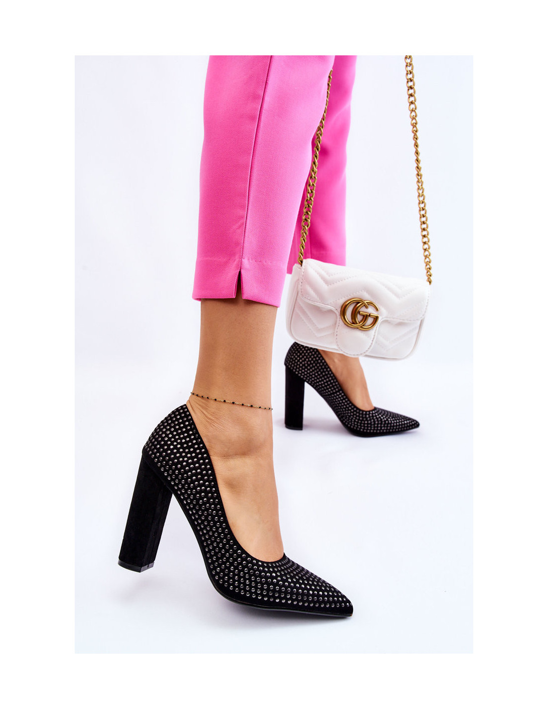 Klasikiniai aukštakulniai pagaminti iš zomšos eko odos. Šis modelis turi dekoracijas smeigėmis. Aukštakulniai buvo pastatyti ant kulno stulpelio pavidalu. Vidpadis pagamintas iš eko odos. Modelis su smailiu pirštu optiškai lieknina kojas. Puikus modelis visoms šventėms. Renkantis dydį, vadovaukitės dydžių lentele.
