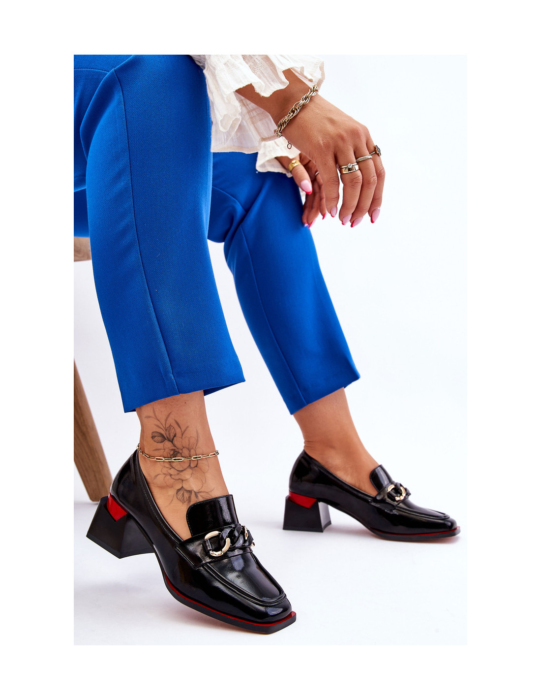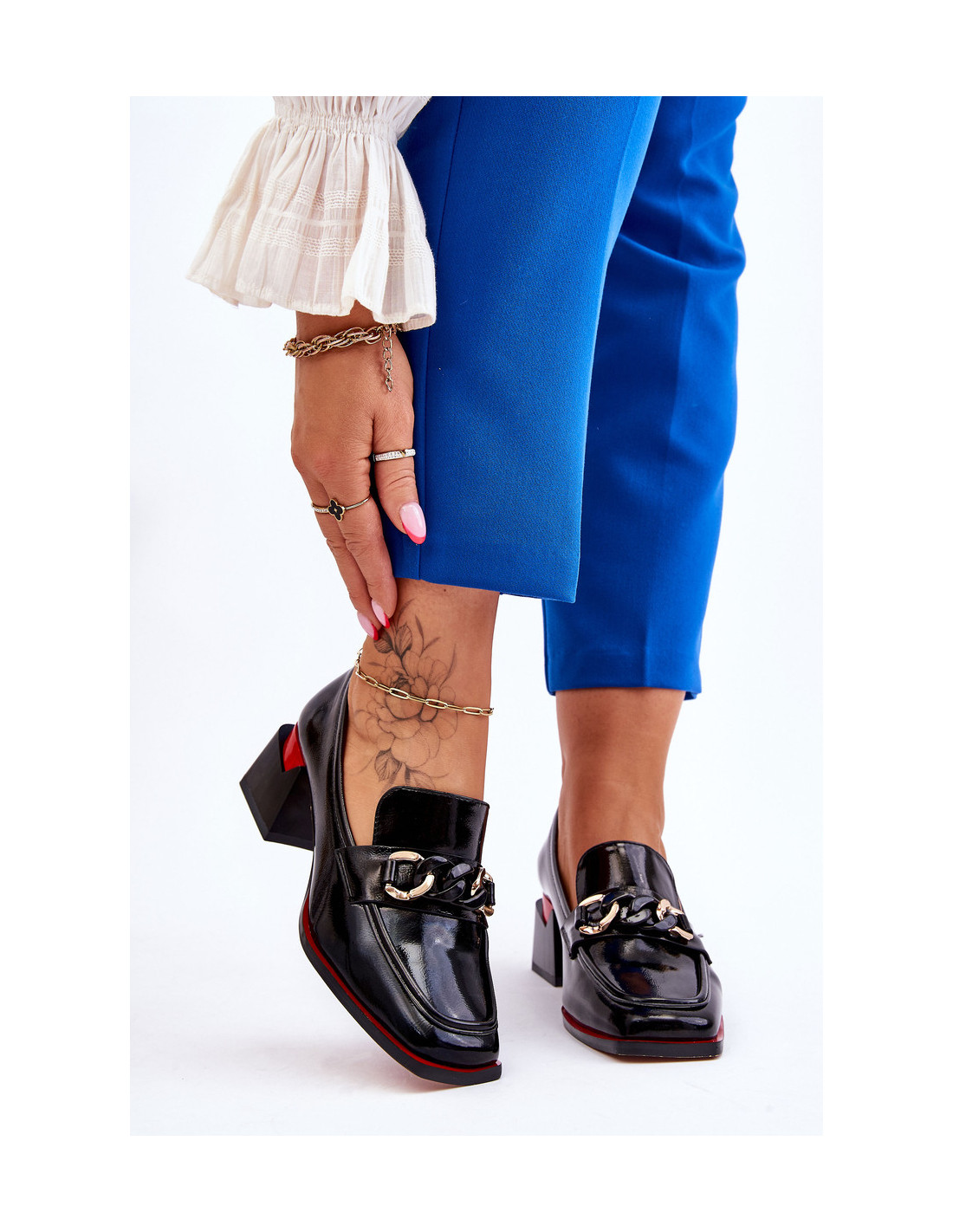 Žemakulniai aukštakulniai bloko formos. Jie papuošti plastikine grandinėle viršutinėje dalyje. Pagaminta iš eko odos. Minkštas vidpadis suteiks komforto kiekviename žingsnyje. Šis modelis turi kvadratinę nosį. Be to, kulnas standinamas. Šios aukštakulniai puikiai tiks prie elegantiškų kelnių ar ilgesnių, klostuotų sijonų. Rinkdamiesi dydį, žiūrėkite dydžių lentelę.