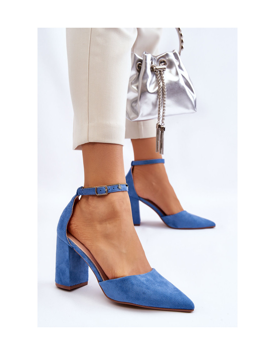 Klasikinės aukštakulniai su smailiu pirštu yra pagamintos iš ekologiškos zomšos. Aplink kulkšnį užsegama sagtimi su reguliuojamu dirželiu. Minkštas vidpadis iš eko odos užtikrina aukštą naudojimo komfortą. Aukštakulniai buvo pastatyti ant kulno stulpelio pavidalu. Jie puikiai tiks prie suknelių, elegantiškų kelnių ar džinsų. Rinkdamiesi dydį, vadovaukitės dydžių lentele