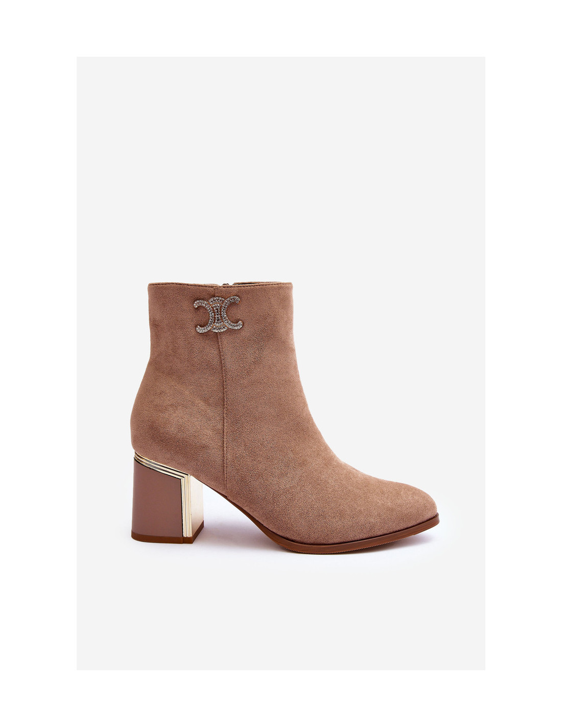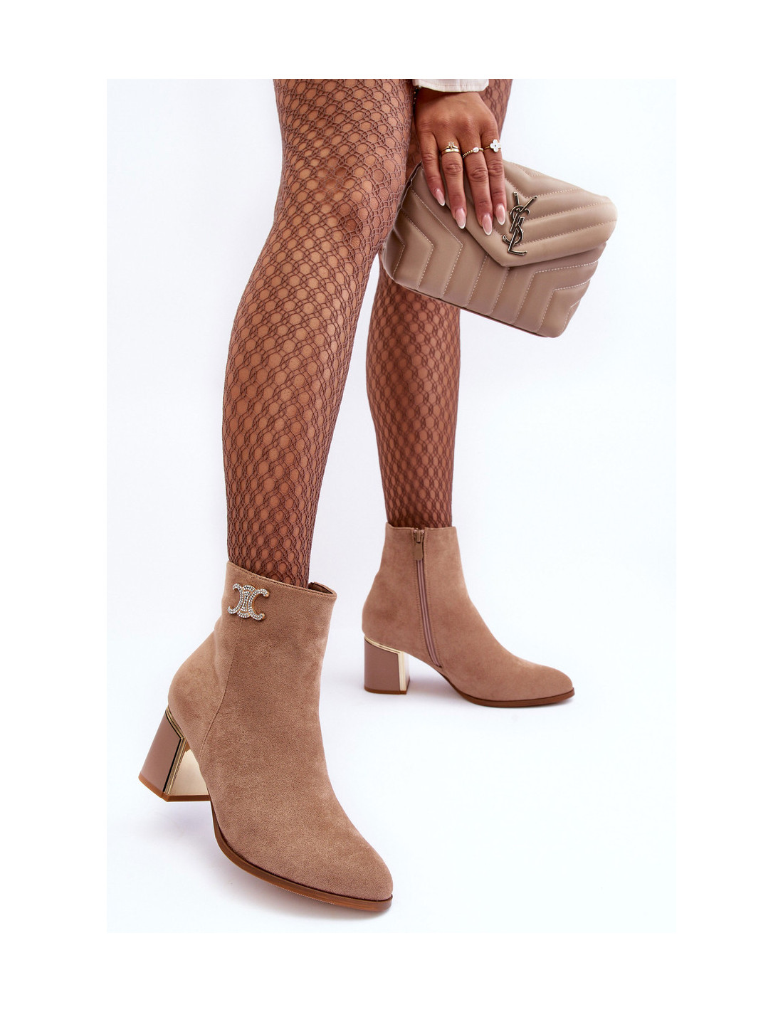 Moteriški kulkšnies batai. Pagaminta iš švelnios liesti ekologiškos zomšos. Pastatykite ant stabilaus kulno. Viduje užsegamas užtrauktuku. Ant kulno – veidrodinis elementas, o koto viršuje – papuošalas. Pirštas standintas, vidus apšiltintas batų pamušalu. Renkantis dydį, žiūrėkite dydžių lentelę.