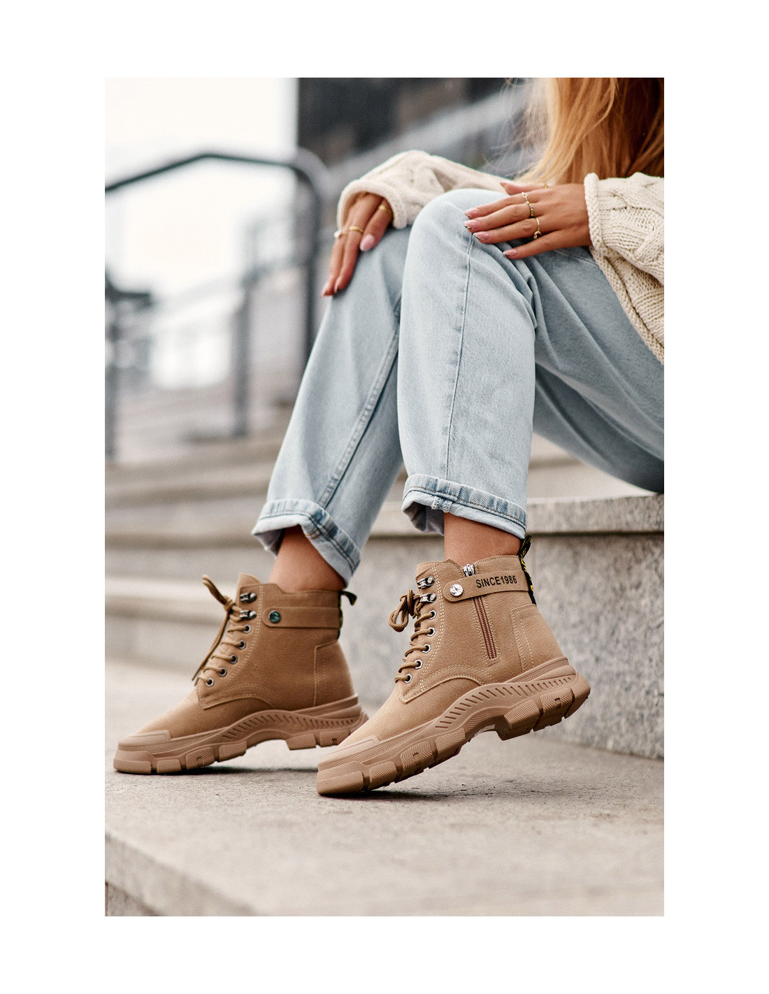 Moteriškos gaudyklės ant plokščio kulno ir platformos. Pagaminta iš ekologiškos zomšos. Užsegamas užtrauktuku viršutinės dalies išorėje ir papildomai suvarstomas. Kojos pirštas sustingęs, nosys suapvalintos. Masyvus padas ir plokščias kulnas užtikrina, kad batai yra stabilūs, kai naudojami ant nelygaus paviršiaus. Renkantis dydį, vadovaukitės dydžių lentele.