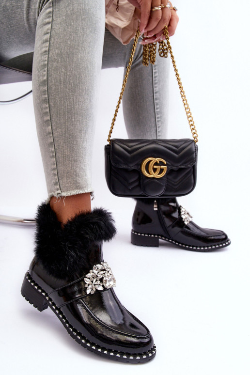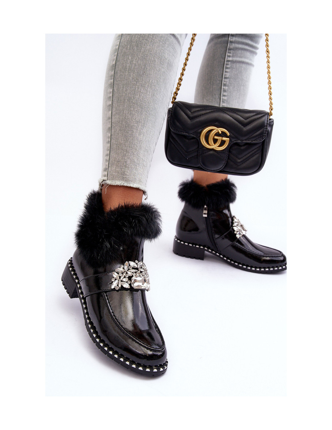 Moteriški batai iš ekologiškos odos. Nustatykite ant plokščio kulno. Vidus apšiltintas batų pamušalu. Apvalūs kojų pirštai. Kailio ir papuošalų puošmena ant koto. Šio bato pirštas yra standus. Minkštas vidpadis suteikia komforto naudojimo metu. Užtrauktukas šone. Renkantis dydį, žiūrėkite dydžių lentelę.