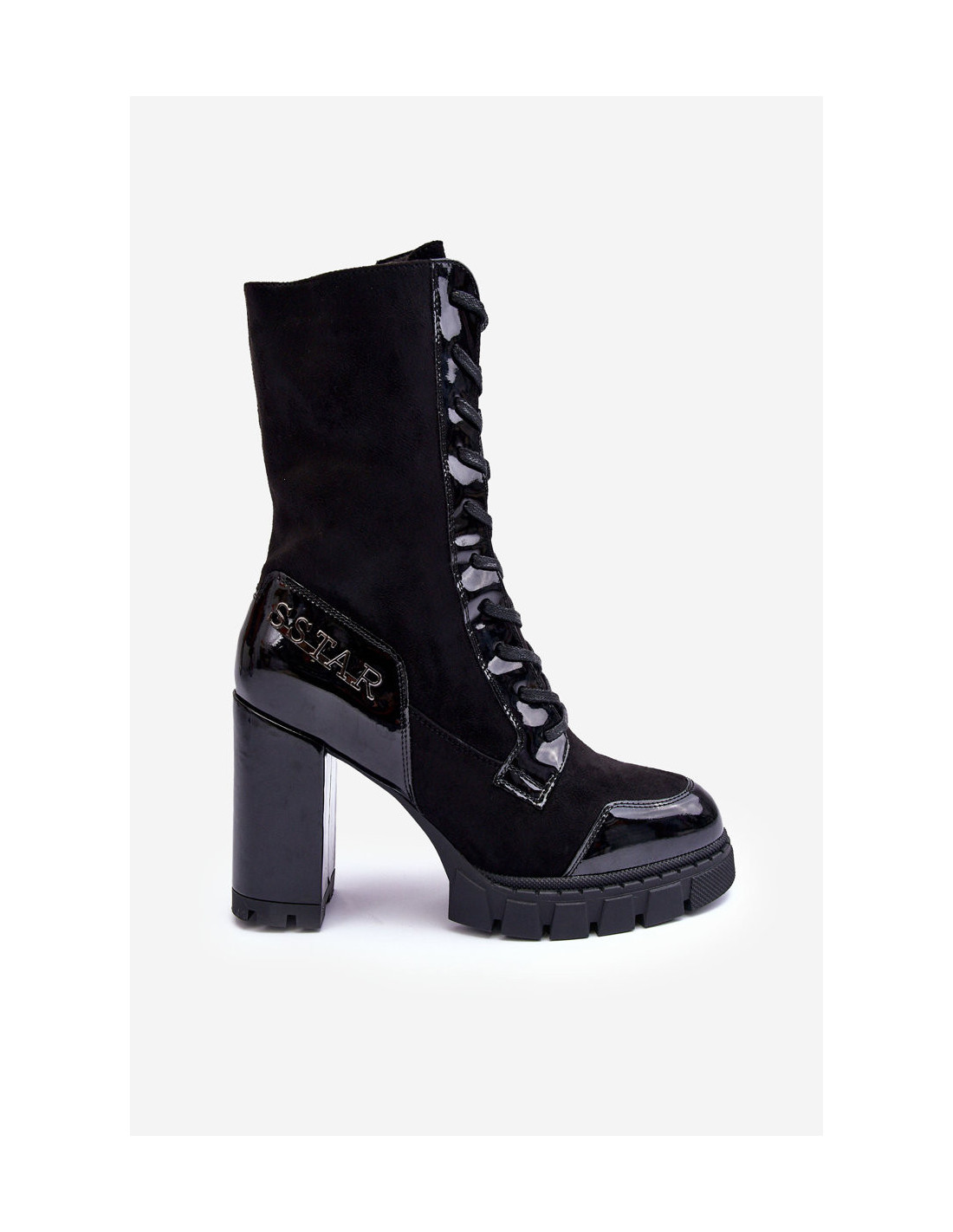 Moteriški kulkšnies batai, pagaminti iš ekologiškos odos ir ekologiškos zomšos derinio. Priekyje yra raišteliai ir papildomas užtrauktukas šone. Kulnas aukšto stulpelio formos. Modelis su aukštesniu velenu. Vidus apšiltintas batų antklode. Be to, pirštas yra standus. Renkantis dydį, vadovaukitės dydžių lentele.