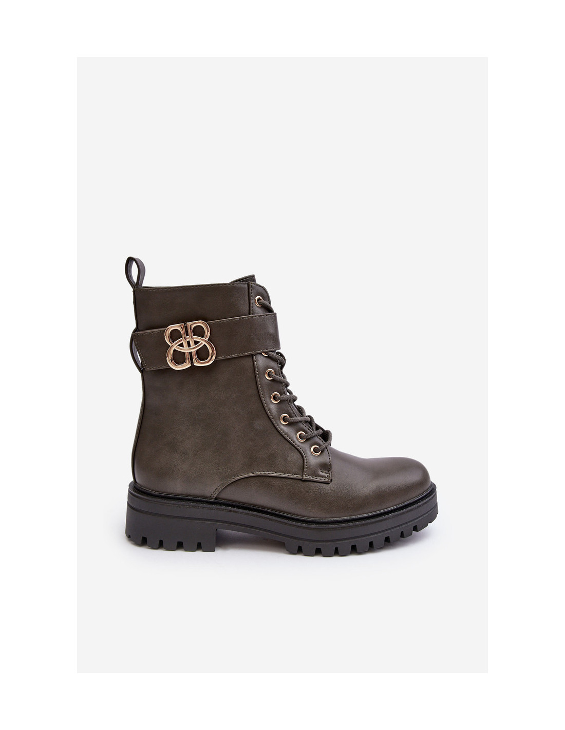 Moteriški batai ant plokščio, stabilaus kulno. Suvarstomas priekyje ir papildomai užsegamas užtrauktuku. Pirštai suapvalinti. Vidus išklotas batų pamušalu. Viršuje diržas su auksine puošyba. Be to, kulnas yra standus. Renkantis dydį, vadovaukitės dydžių lentele.