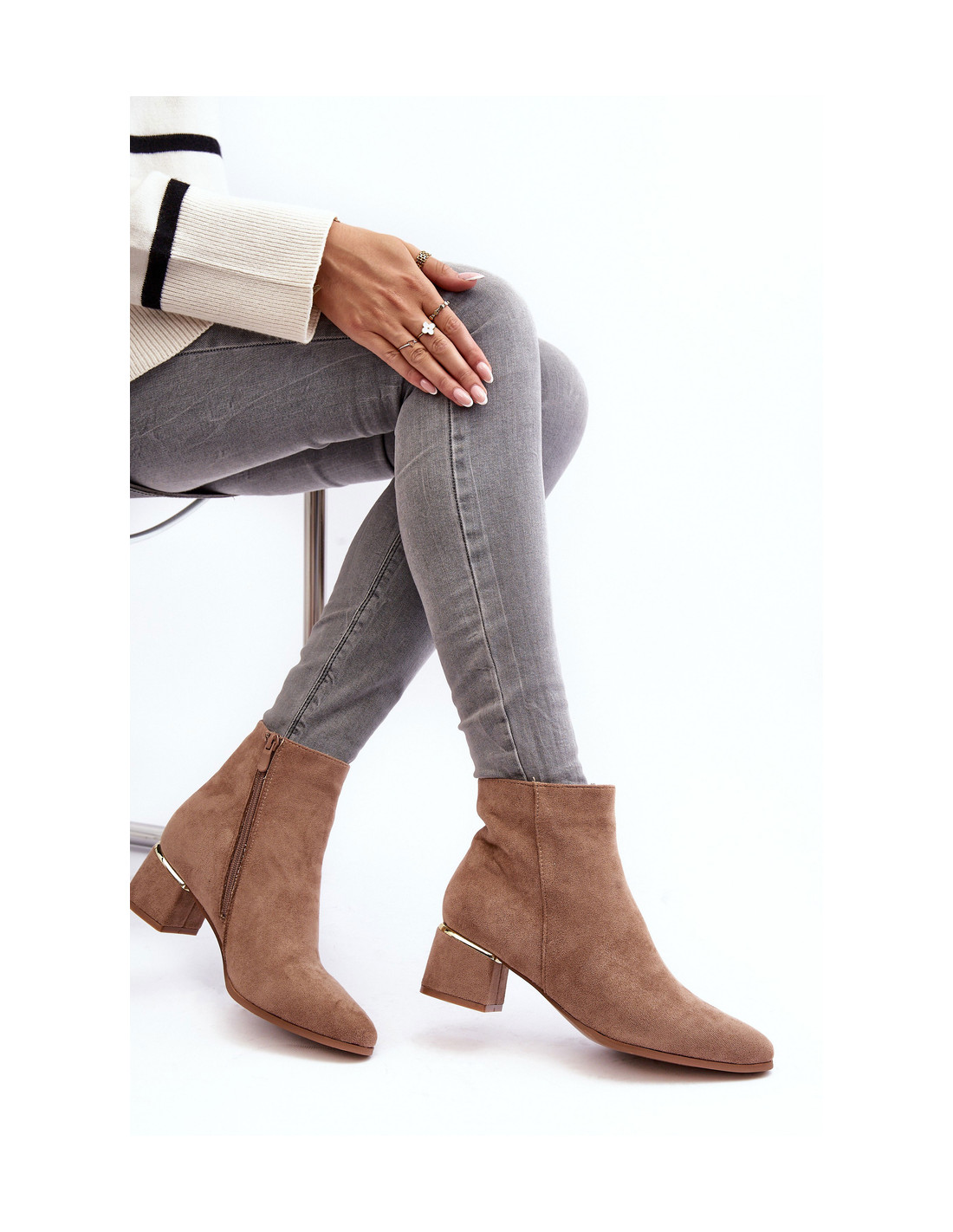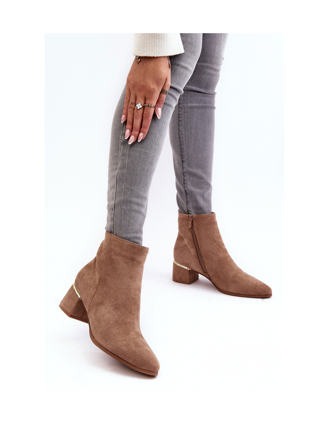 Moteriški batai iš ekologiškos zomšos. Pastatykite ant žemo blokinio kulno. Migdoliniai pirštai. Viršutinė dalis iki kulkšnies. Vidus apšiltintas batų antklode. Šis modelis šone užsegamas užtrauktuku. Virš kulno yra veidrodinis auksinis dekoras. Renkantis dydį, vadovaukitės dydžių lentele.
