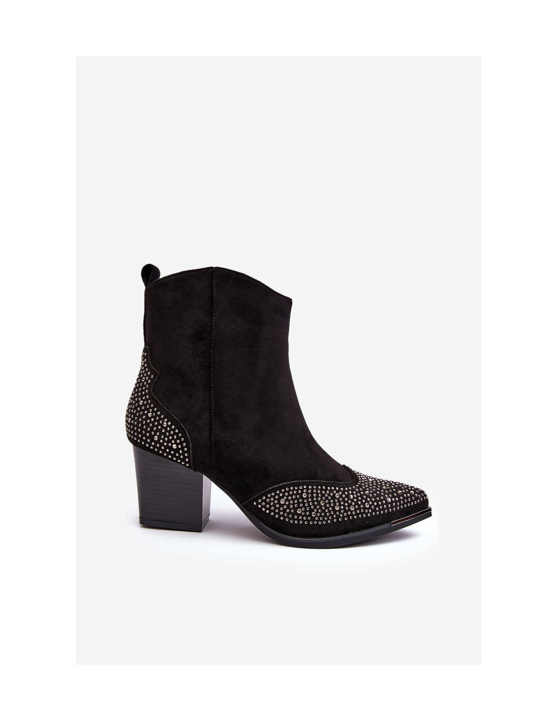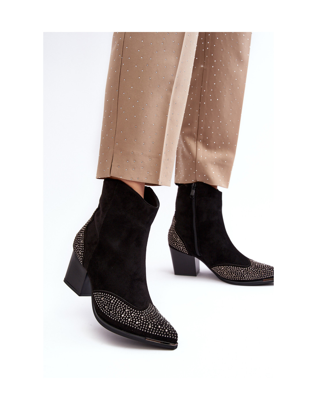 Kaubojiško stiliaus batai iš ekologiškos zomšos. Nustatyti ant kulno stulpelio pavidalu. Smailūs pirštai optiškai lieknins kojas. Viršutinė dalis dekoruota mažais kalnų krištolais. Vidus apšiltintas batų antklode. Modelis užsegamas užtrauktuku. Renkantis dydį, vadovaukitės dydžių lentele.