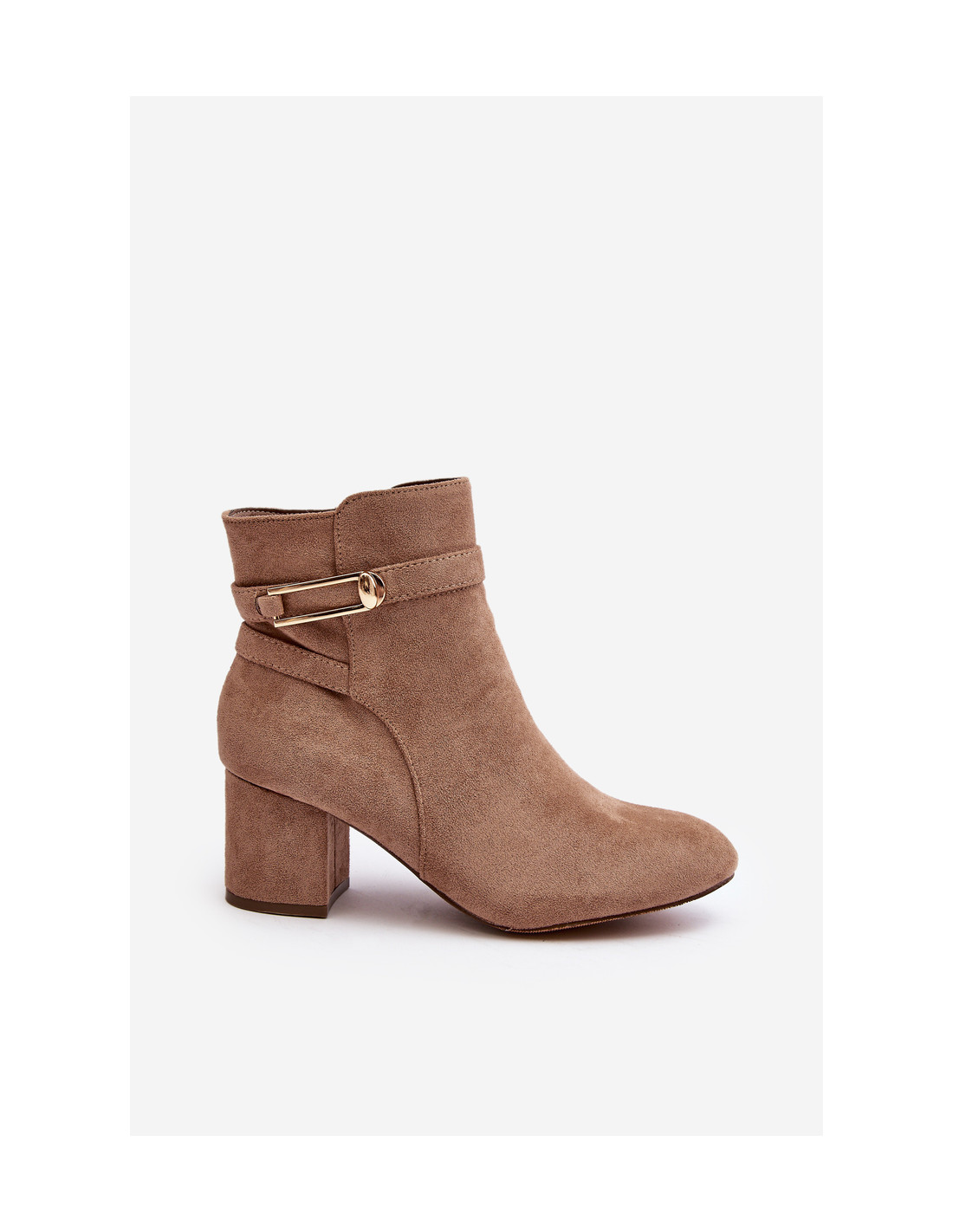Moteriški kulkšnies batai. Nustatyti ant kulno žemo stulpelio pavidalu. Pagaminta iš ekologiškos zomšos. Užsegamas užtrauktuku. Suapvalinti kojų pirštai. Vidus apšiltintas batų antklode. Viršuje yra dvi plonos juostelės. Be to, šis modelis turi standintą kulną. Renkantis dydį, vadovaukitės dydžių lentele.