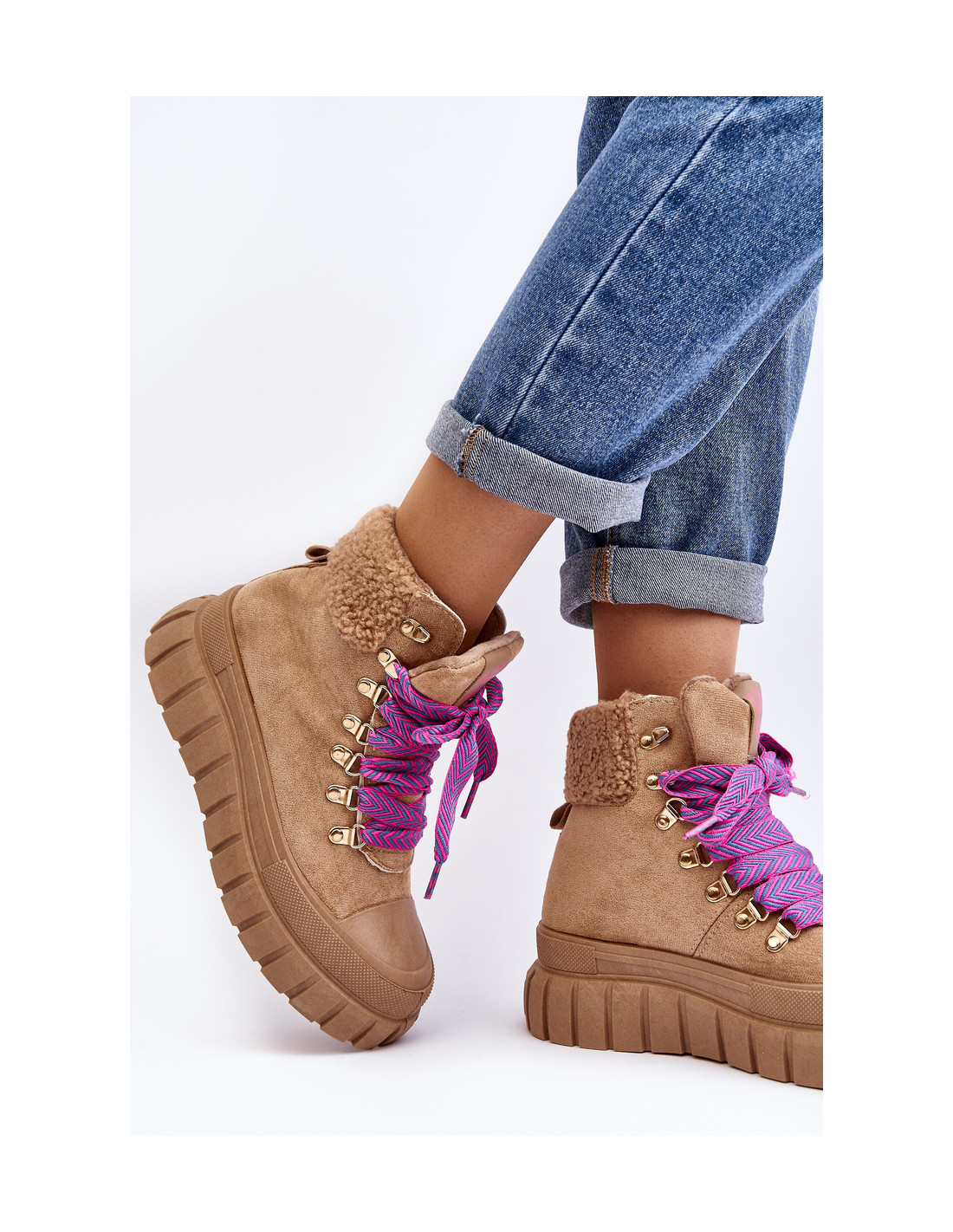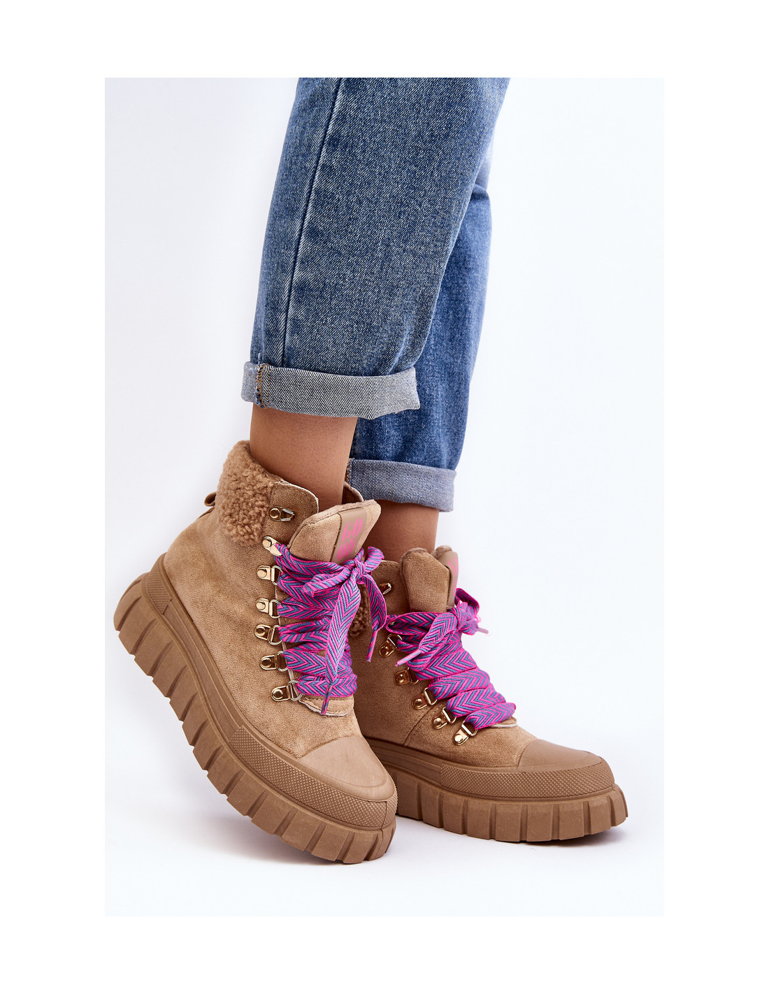 Moteriški batai pagaminti iš ekologiškos zomšos. Montuojamas ant masyvios platformos, pagamintos iš guminės medžiagos. Vidus apšiltintas batų antklode, kuri užtikrina komfortą ir šilumą šaltesnėmis dienomis. Pirštai suapvalinti, o tai suteikia batams subtilaus žavesio. Klasikinis suvarstomas modelis. Madinga avalynė puikiai papildys jūsų garderobą! Renkantis dydį, vadovaukitės dydžių lentele.