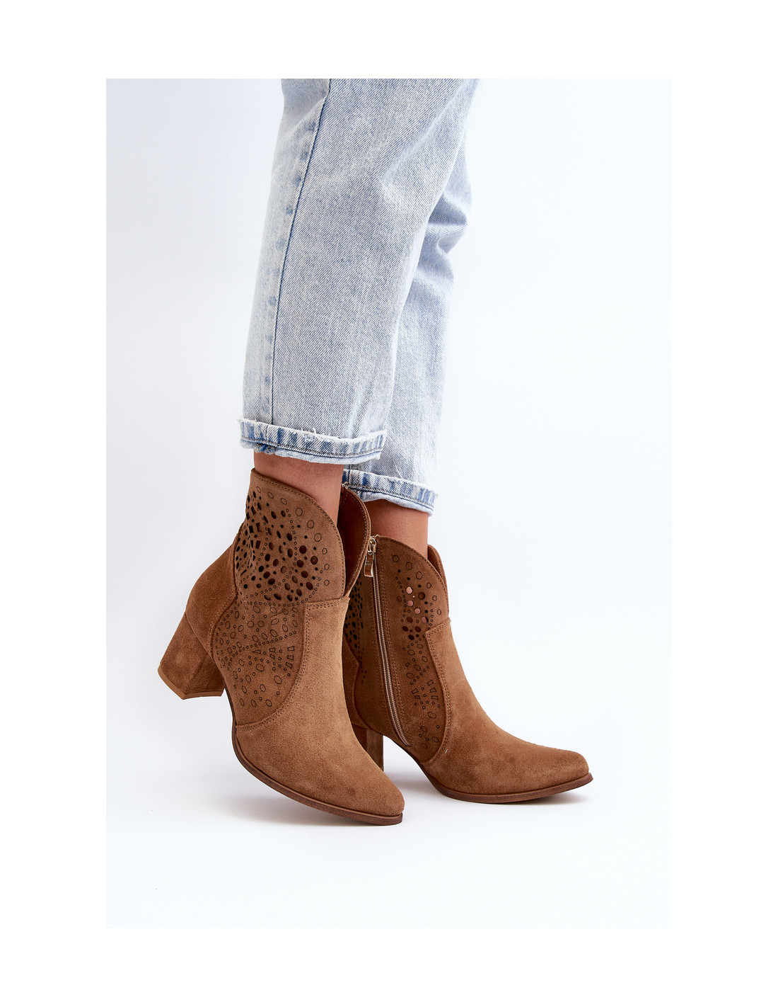 Moteriški aukštakulniai batai yra pagaminti iš natūralios zomšos. Dėl ažūrinio rašto ir kulno jie dera su daugeliu stilių. Užsegamas užtrauktuku. Minkštas, itin patogus vidpadis užtikrins komfortą naudojimo metu. Jūs tikrai turėtumėte juos turėti! Renkantis dydį, vadovaukitės dydžių lentele.