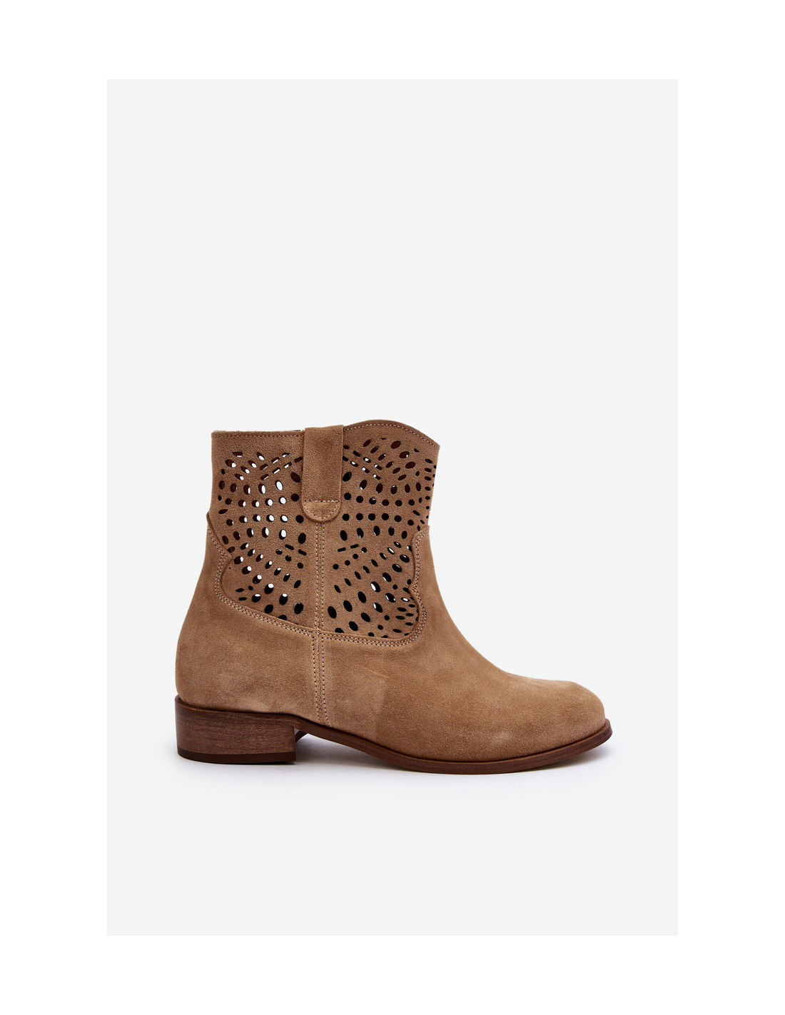 Moteriški kulkšnies batai su ažūrine viršutine dalimi iš natūralios zomšos. Statomas ant plokščio, stabilaus kulno. Suapvalinti kojų pirštai. Šoniniai viršutiniai užtrauktuku. Be to, šis modelis turi standintą kulną. Puikiai tinka pavasario stiliui! Renkantis dydį, vadovaukitės dydžių lentele.