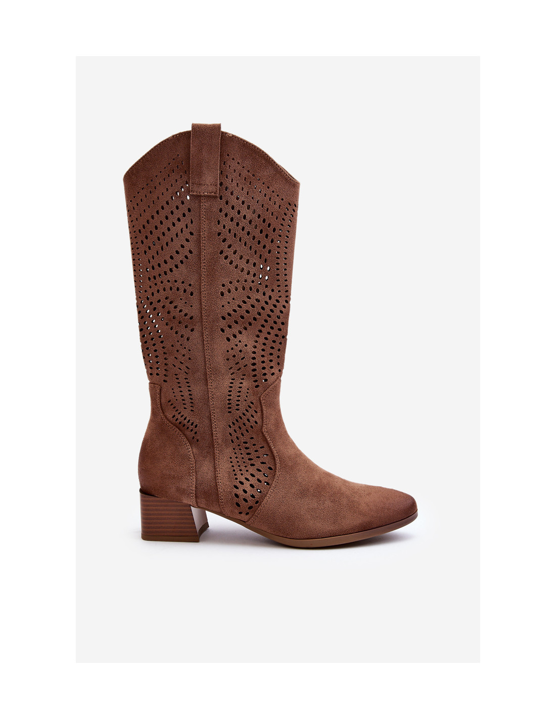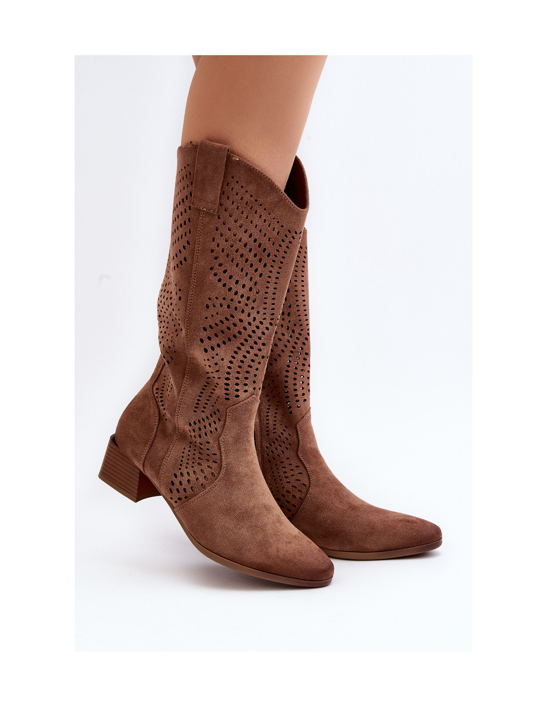 Ažūriniai auliniai batai iki blauzdos vidurio. Pagaminta iš ekologiškos zomšos. Pastatykite ant žemo, stabilaus kulno. Migdoliniai pirštai optiškai suplonins kojas. Šis modelis užsegamas užtrauktuku. Natūralios odos vidpadis užtikrina komfortą dėvint. Jūs tikrai turėtumėte juos turėti savo pavasario garderobe! Renkantis dydį, vadovaukitės dydžių lentele.