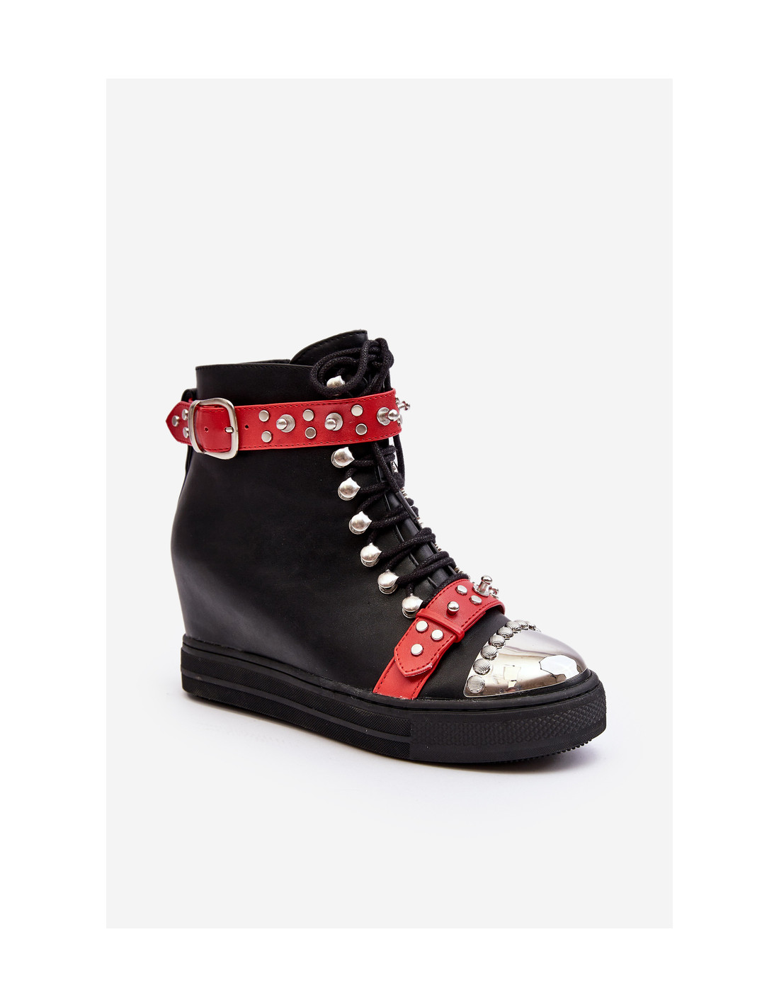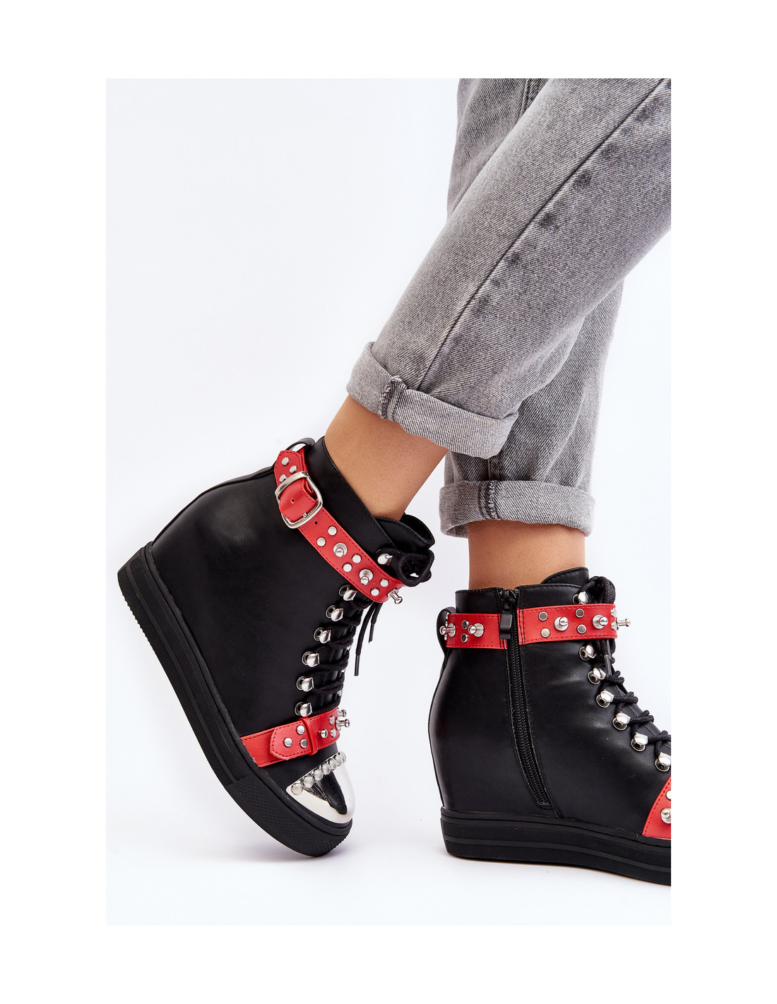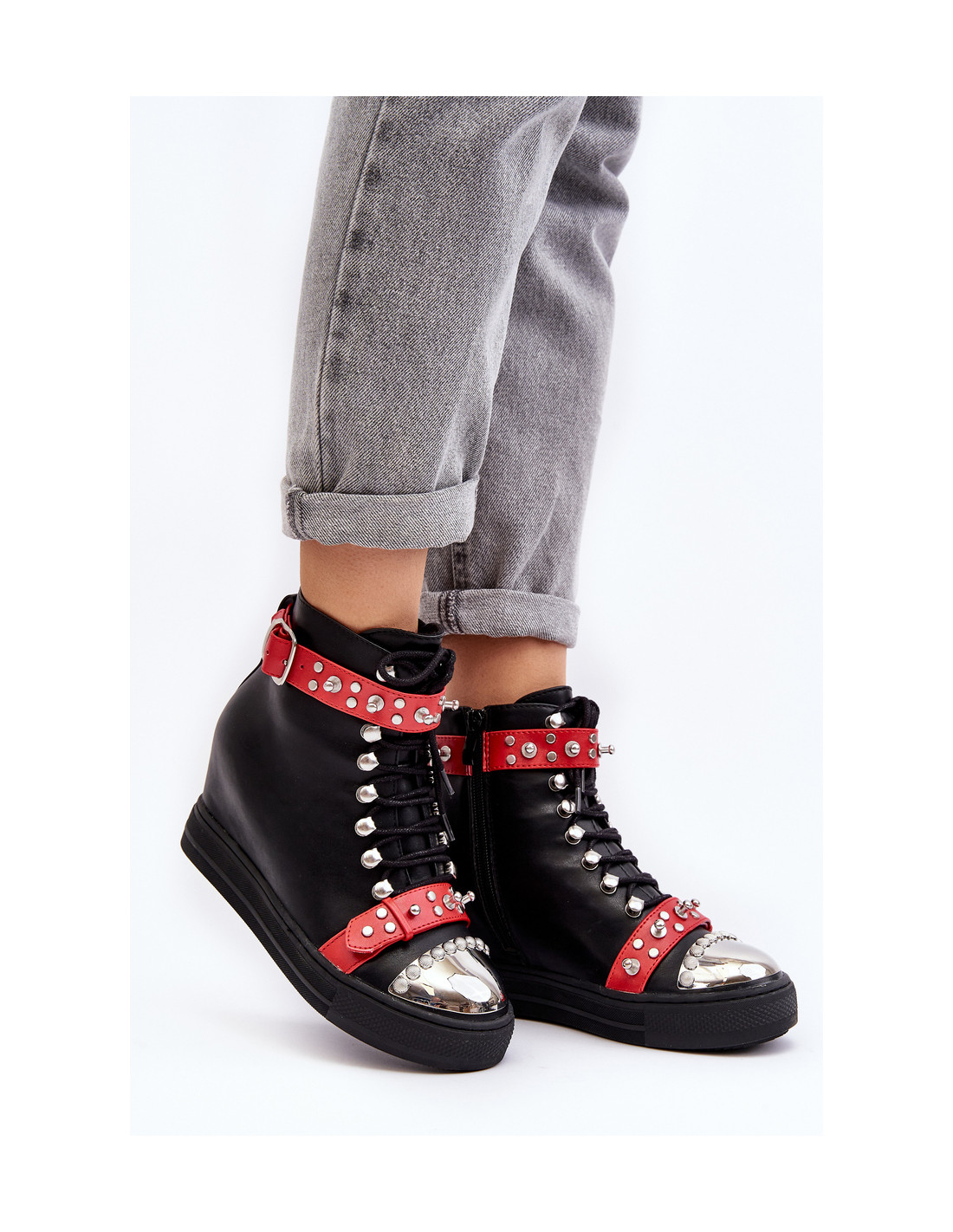 Unikalūs pleištiniai batai su kalnų krištolais ir sagtimis. Batai pagaminti iš eko odos. Jie turi izoliaciją batų antklodės pavidalu. Kulkšnies batai puikiai tiks prie glam rock ar grunge stiliaus. Būtinai peržiūrėkite visą mūsų moteriškų kulkšnies batų kolekciją! Renkantis dydį, vadovaukitės dydžių lentele.