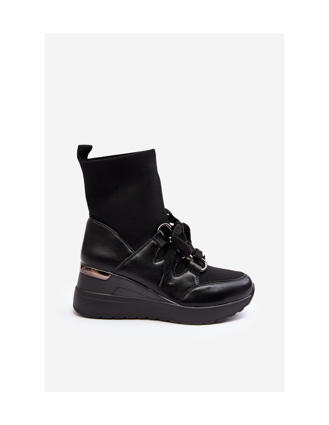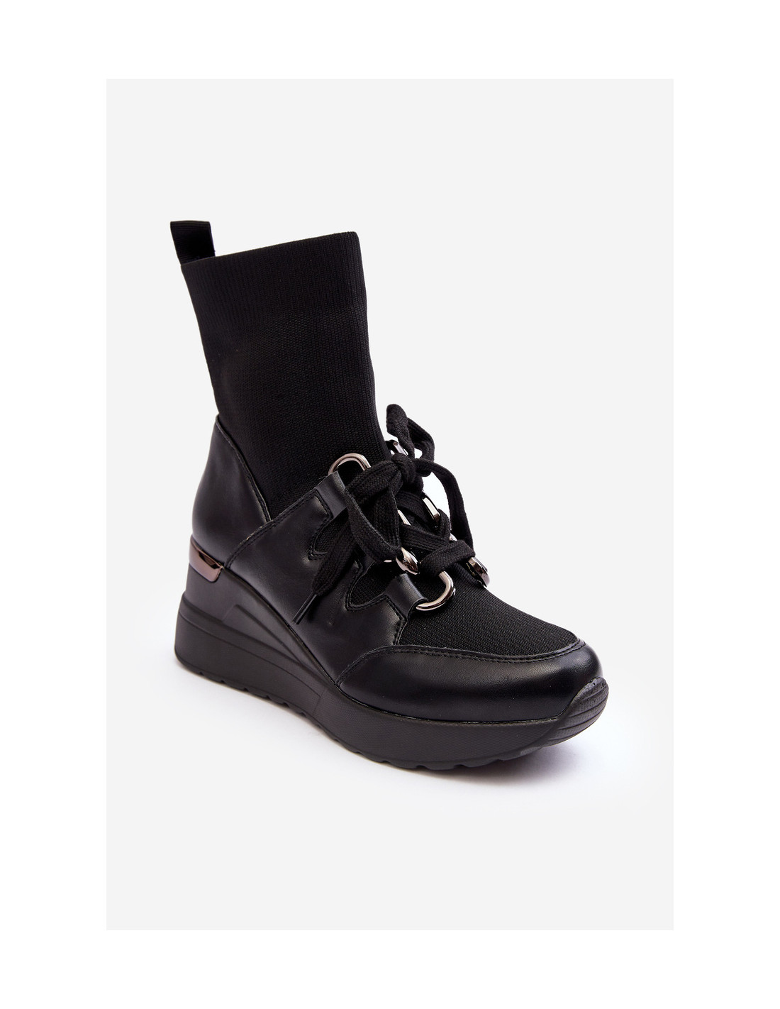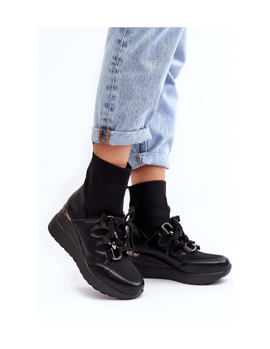 Moteriški sportinio stiliaus batai, pagaminti iš eko odos ir tekstilės derinio. Nustatykite ant pleišto. Kojinės formos viršus. Slip-on modelis su papildomais raišteliais. Suapvalinti kojų pirštai. Sutvirtintas kulnas. Minkštas, ekologiškos odos vidpadis užtikrina komfortą naudojimo metu. Renkantis dydį, vadovaukitės dydžių lentele.