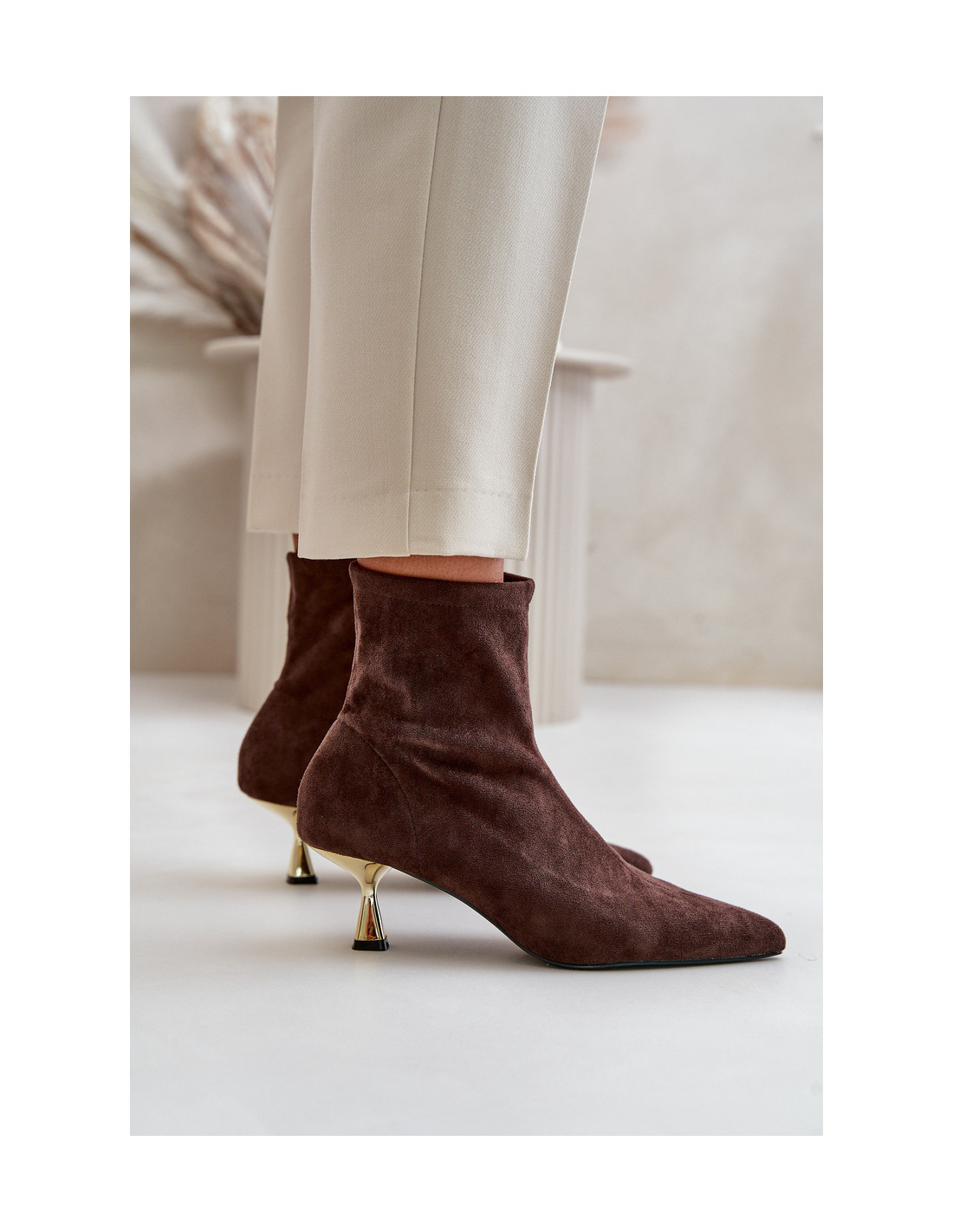 Moteriški batai ant aukšto kulno, ekologiški zomšiniai smailiais pirštais, ruda „Irithare“.