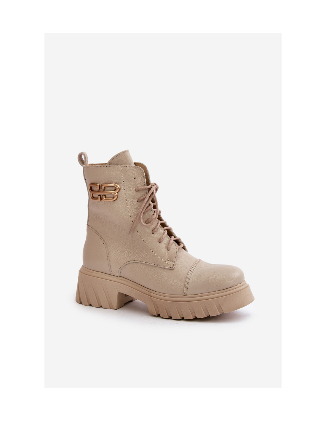 Moteriški batai iš natūralios odos. Įrengtas ant masyvaus, plokščio kulno ir platformos. Jie turi ir suvarstymą, ir užtrauktuką, kuris užtikrina patogų užsidėjimą ir prigludimą prie pėdos. Batviršio šone yra puošni auksinė detalė, kuri suteikia elegancijos. Vidus apšiltintas batų antklode. Puikiai tinkantys rudens ir žiemos stiliui, šie kulkšnies batai sujungia eleganciją ir funkcionalumą. Renkantis dydį, vadovaukitės dydžių lentele