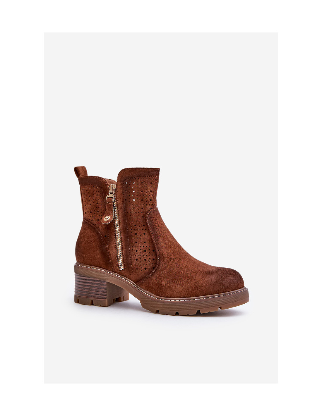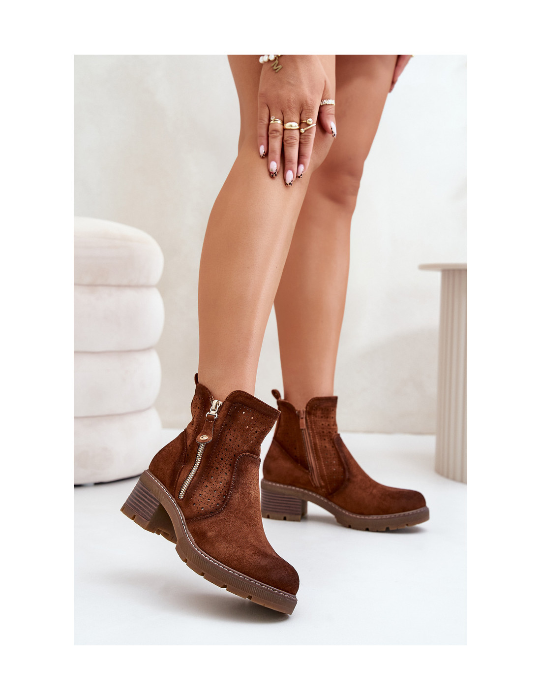 Moteriški batai iš ekologiškos zomšos. Nustatykite ant žemo, stabilaus kulno. Jiems būdingas ažūrinis viršus, kuris suteikia lengvumo ir subtilaus žavesio. Užsegami užtrauktuku, užtikrina patogumą ir patogumą užsidėti. Suapvalinti kojų pirštai. Šis modelis jums tikrai patiks! Renkantis dydį, vadovaukitės dydžių lentele.