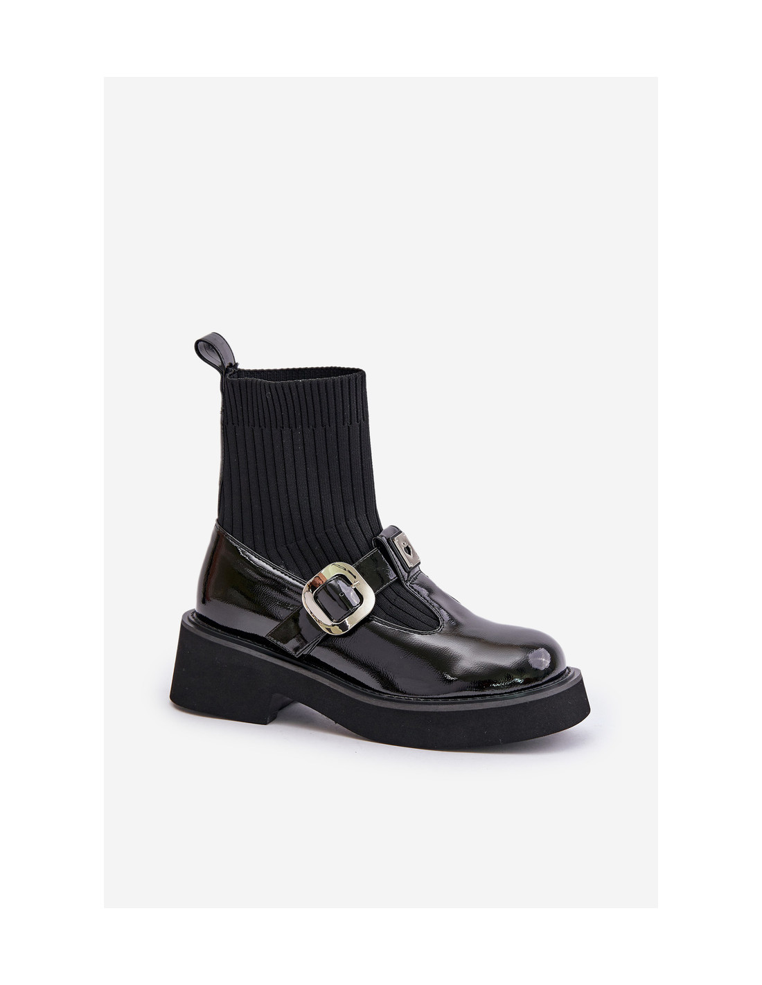 Lakuoti moteriški batai žemu, plačiu kulnu ir platforma. Kojinės formos viršutinė dalis, papildomai dekoruota stilingu diržu su sagtimi, suteikia jiems modernumo. Vidus apšiltintas batų antklode tik pėdos lygyje. Puikiai tinka miesto stiliui, jie derina komfortą ir madingą išvaizdą. Renkantis dydį, vadovaukitės dydžių lentele.