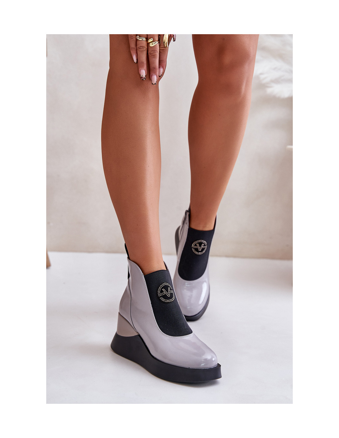 Moteriški batai iš natūralios odos. Pastatykite ant pleišto ir platformos. Užsegamas užtrauktuku šone. Viršuje yra elastingas įdėklas ir nedidelis papuošimas. Suapvalinti kojų pirštai. Vidus apšiltintas batų antklode. Šis modelis yra puikus pasirinkimas moterims, ieškančioms madingų ir patogių kasdienių batų! Renkantis dydį, vadovaukitės dydžių lentele.