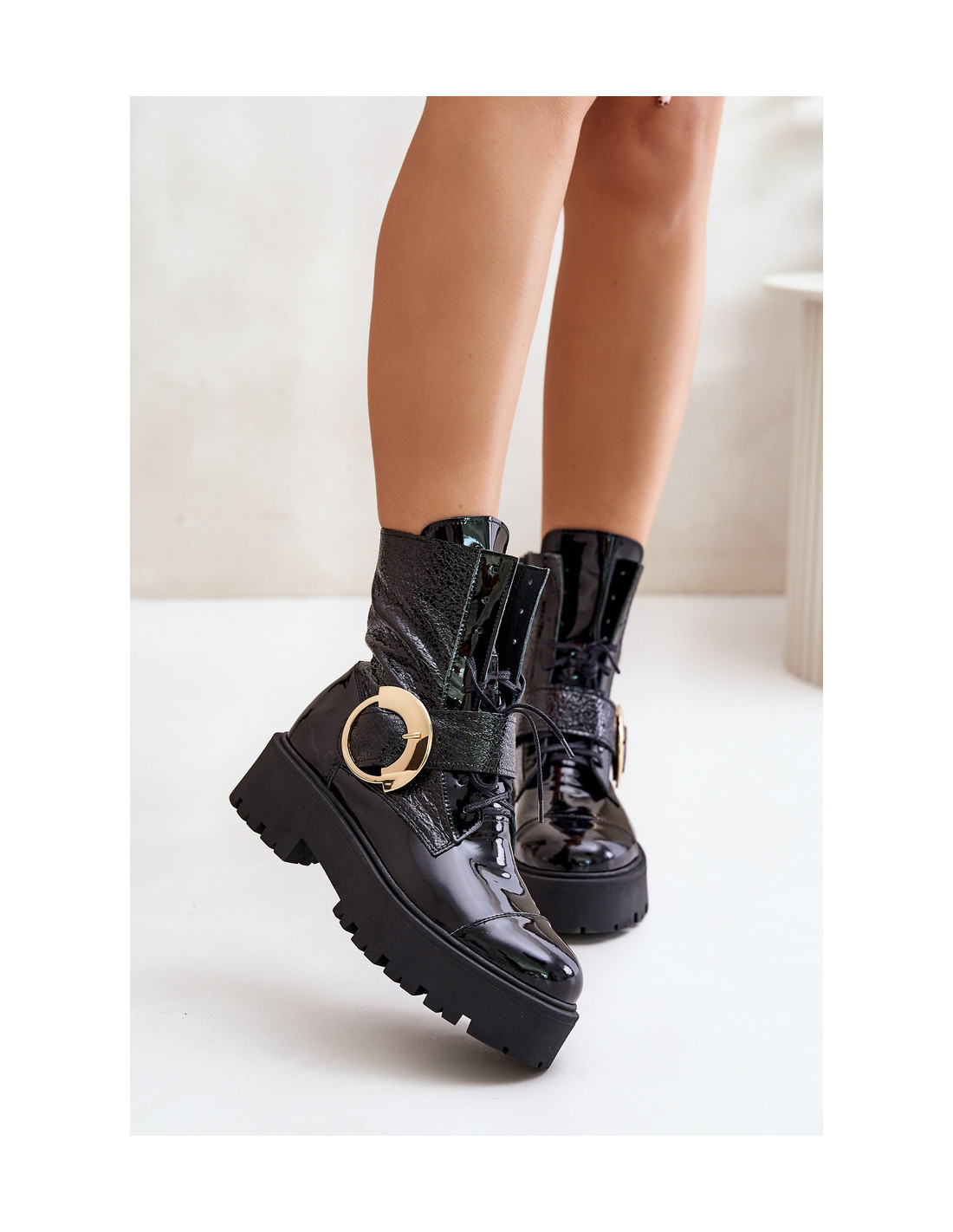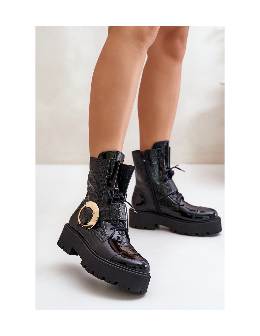 Unikalūs batai iš natūralios odos. Ant platformos ir plokščio kulno jie užtikrina stabilumą ir patogumą dėvėti. Modelis užsegamas užtrauktuku, taip pat yra suvarstomas, kad geriau priglustų. Didelė sagtis su dirželiu viršutinėje dalyje yra akį traukianti detalė, suteikianti joms madingą, išraiškingą charakterį. Renkantis dydį, vadovaukitės dydžių lentele.