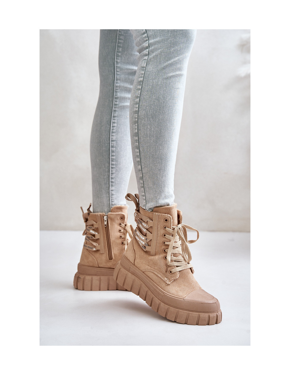 Moteriški batai iš ekologiškos zomšos. Užsegamas užtrauktuku ir suvarstomas. Pastatykite ant platformos, kuri puikiai izoliuoja jus nuo šaltos žemės. Suapvalinti kojų pirštai. Viduje yra izoliacija batų antklodės pavidalu. Šis modelis išsiskiria papildomais dekoratyviniais raišteliais nugaroje. Jūs tikrai turėtumėte juos turėti! Renkantis dydį, vadovaukitės dydžių lentele.