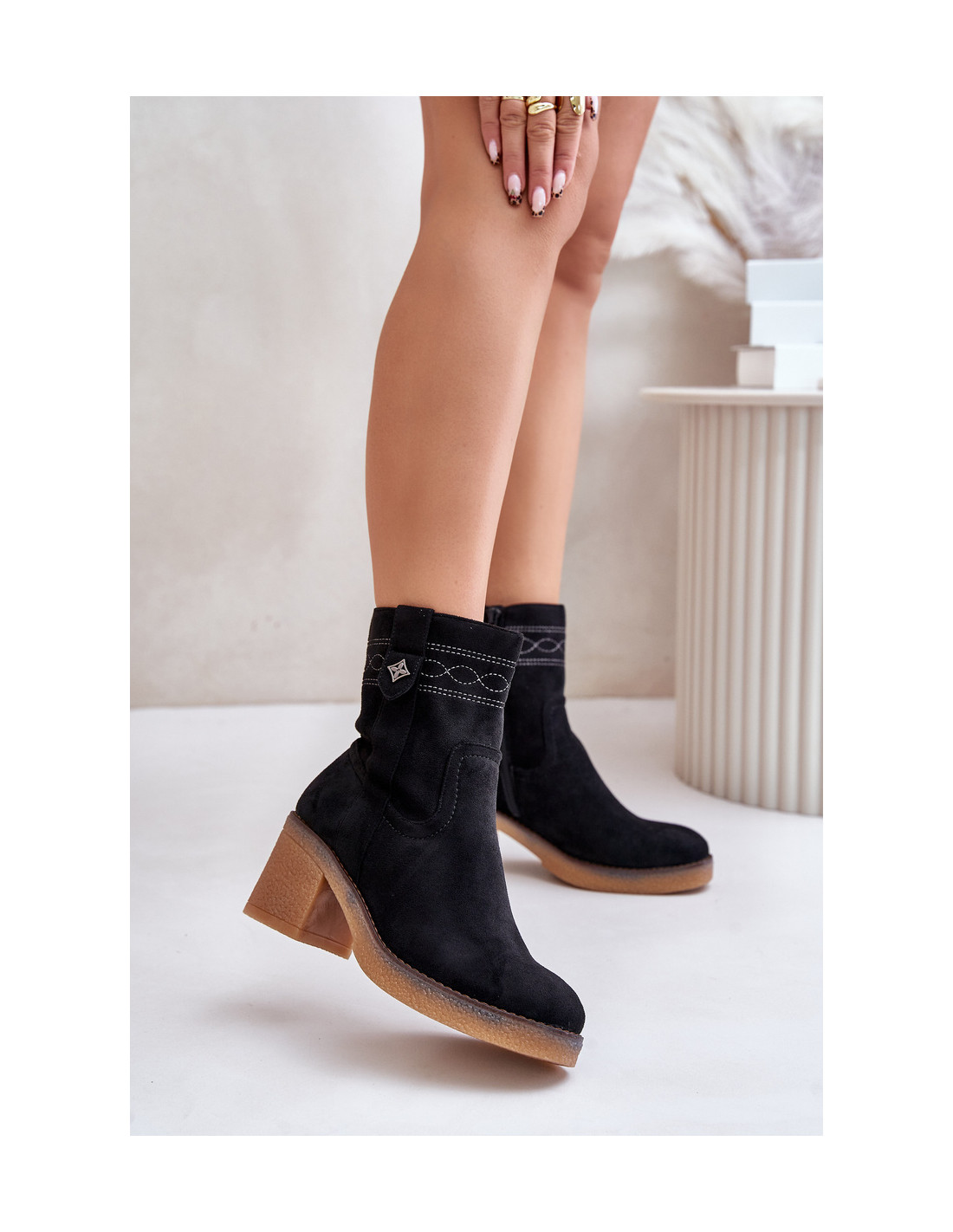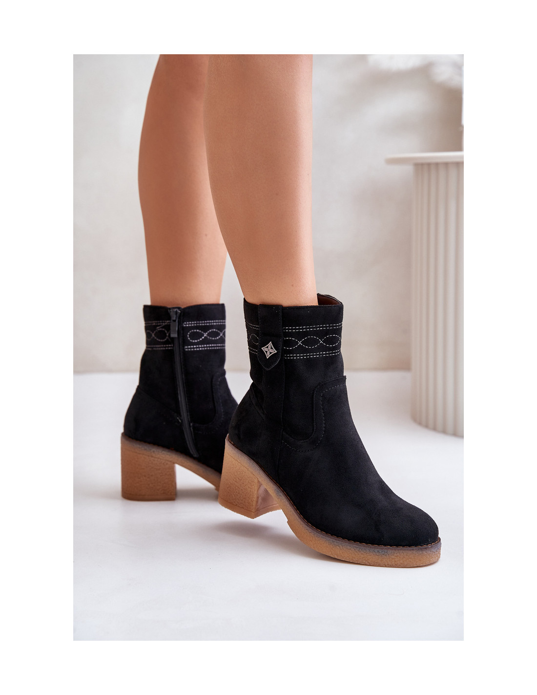 Klasikiniai moteriški batai iš ekologiškos zomšos. Nustatyti ant kulno stulpelio pavidalu. Suapvalinti kojų pirštai. Šis modelis išsiskiria susiuvimu viršutinėje dalyje ir smulkia detale. Vidus apšiltintas minkšta batų antklode, puikiai tinkančia šaltesnėms dienoms. Renkantis dydį, vadovaukitės dydžių lentele.