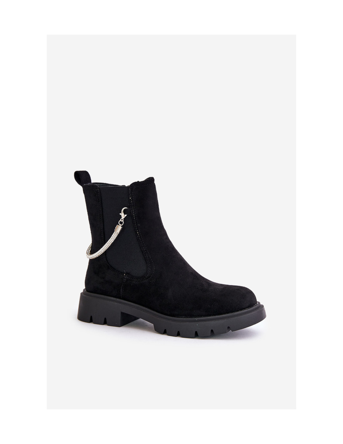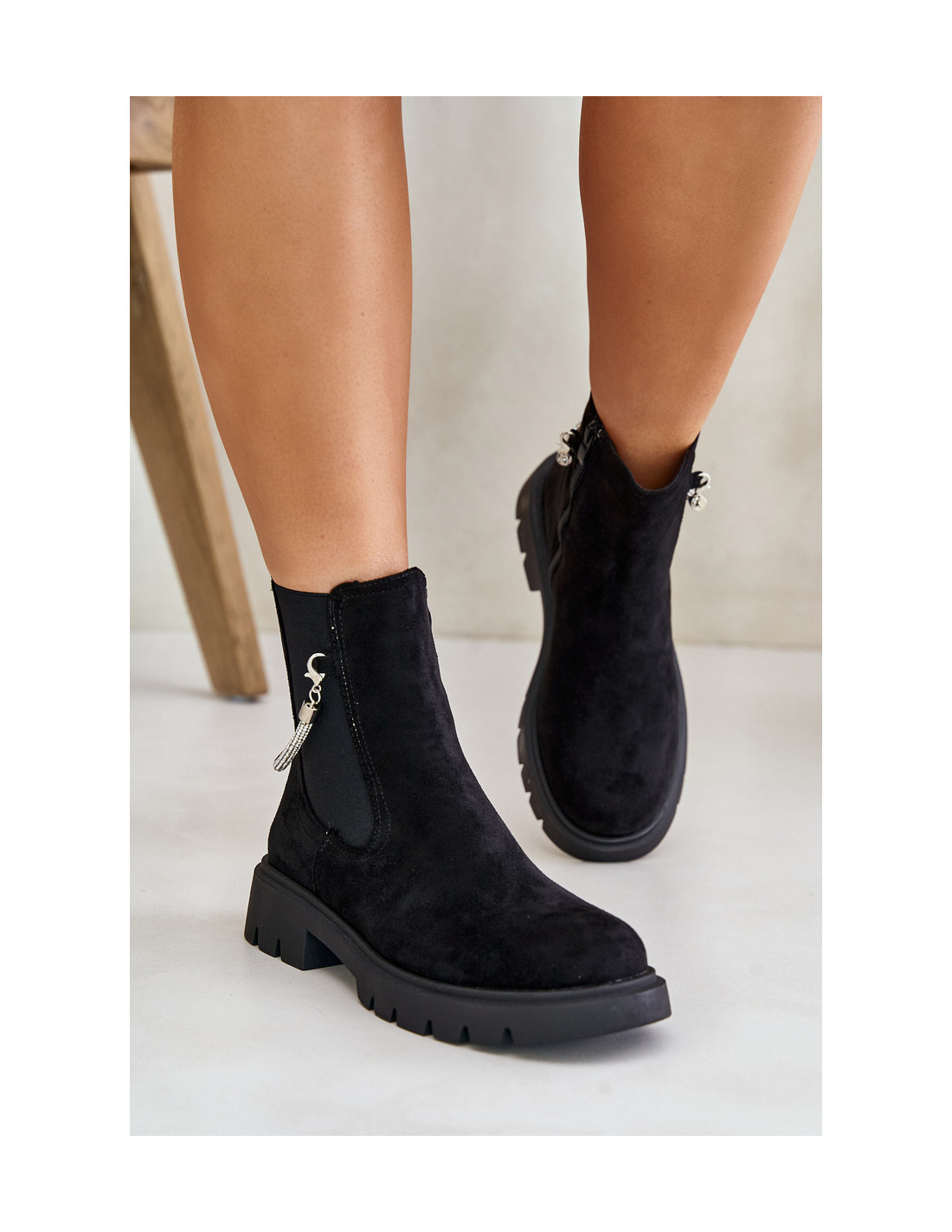 Moteriški batai iš ekologiškos zomšos. Šis modelis išsiskiria dekoratyviu, blizgančiu, nuimamu dirželiu, suteikiančiu nepakartojamo žavesio. Vidus apšiltintas batų antklode, kuri suteiks šilumos ir komforto šaltesnėmis dienomis. Renkantis dydį, vadovaukitės dydžių lentele.