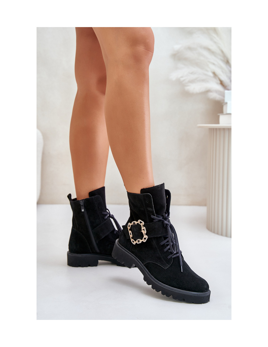 Moteriški batai iš aukštos kokybės natūralios zomšos. Nustatyti ant plokščio kulno, todėl jie yra itin patogūs ir stabilūs. Užsegamas užtrauktuku viršutinės dalies šone ir suvarstomas. Pagrindinis šio modelio privalumas – dekoratyvinė sagtis, kuri suteikia išskirtinio žavesio. Suapvalinti kojų pirštai. Jūs tikrai turėtumėte juos turėti! Renkantis dydį, vadovaukitės dydžių lentele.