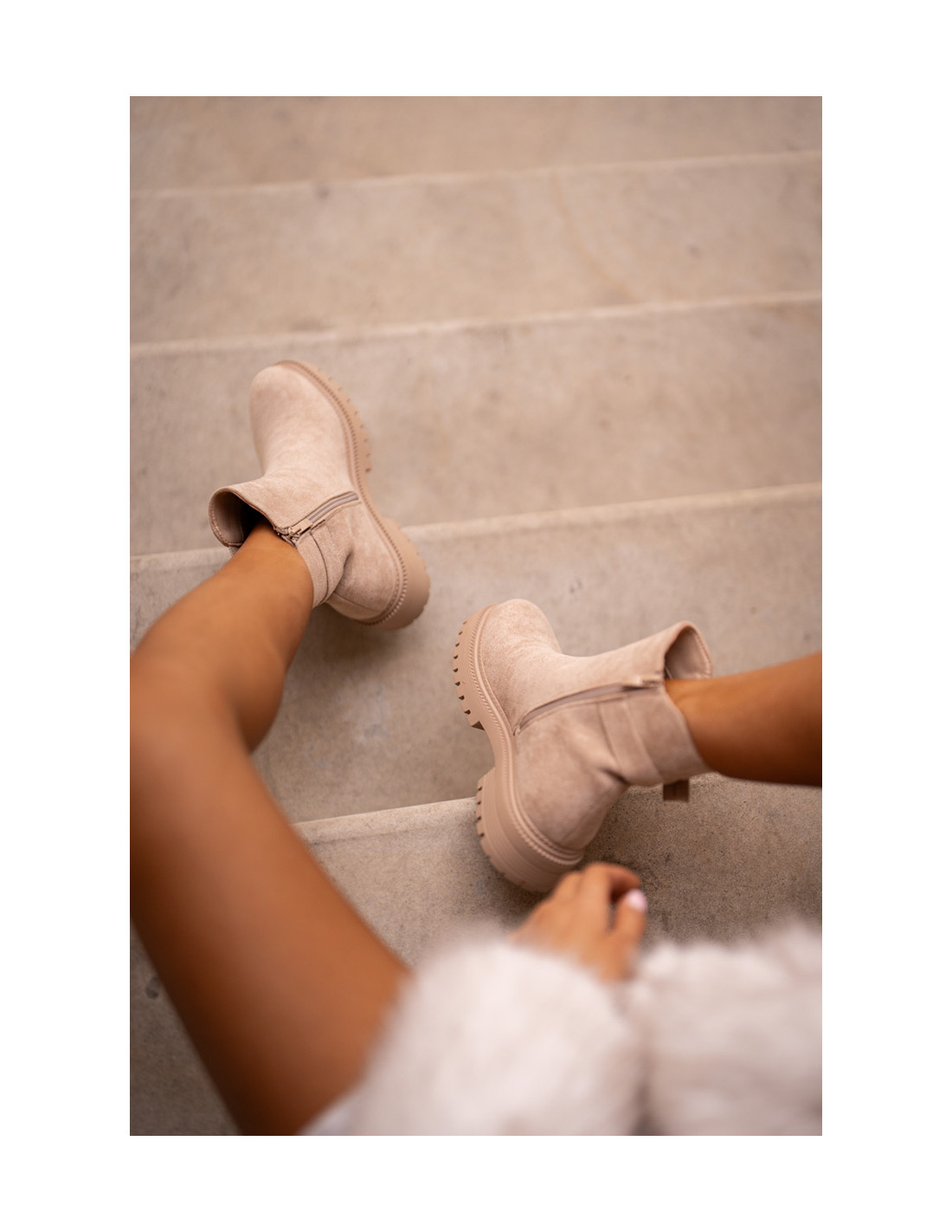 Žemi batai iš ekologiškos zomšos. Statomas ant plokščio, stabilaus kulno. Užsegamas užtrauktuku. Suapvalinti kojų pirštai. Vidus apšiltintas batų antklode. Viršuje dirželis su sagtimi. Klasikinis stilius, kurį turėtumėte turėti savo rudens/žiemos garderobe! Renkantis dydį, vadovaukitės dydžių lentele.