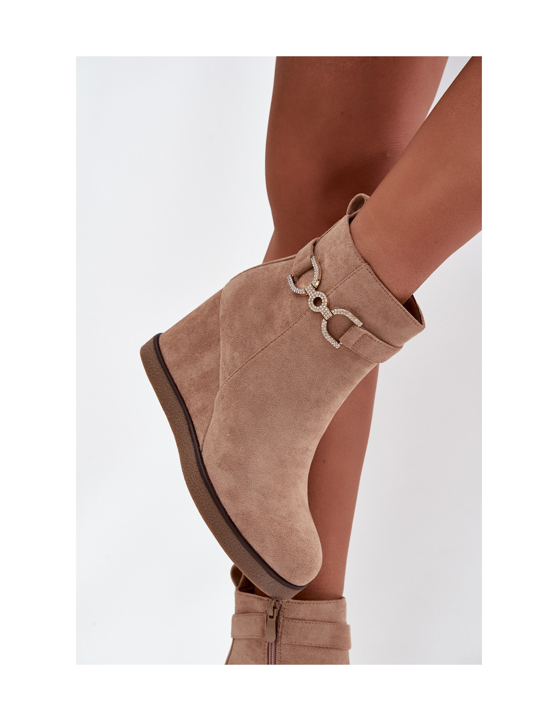 Šie moteriški ekologiškos zomšos aulinukai iki kulkšnių yra stilingas pasirinkimas moterims, vertinančioms patogumą ir madingą išvaizdą. Jų pleišto formos kulnas užtikrina patogumą ir subtiliai paryškina siluetą, o apvalios nosys suteikia joms klasikinį charakterį. Dirželis su dekoratyvine detale aulo viršuje suteikia elegancijos. Šoninis užtrauktukas leidžia jas lengvai apsiauti ir nusiauti, todėl jos yra praktiškas pasirinkimas kasdieniam avėjimui. Renkantis dydį, vadovaukitės dydžių lentele.