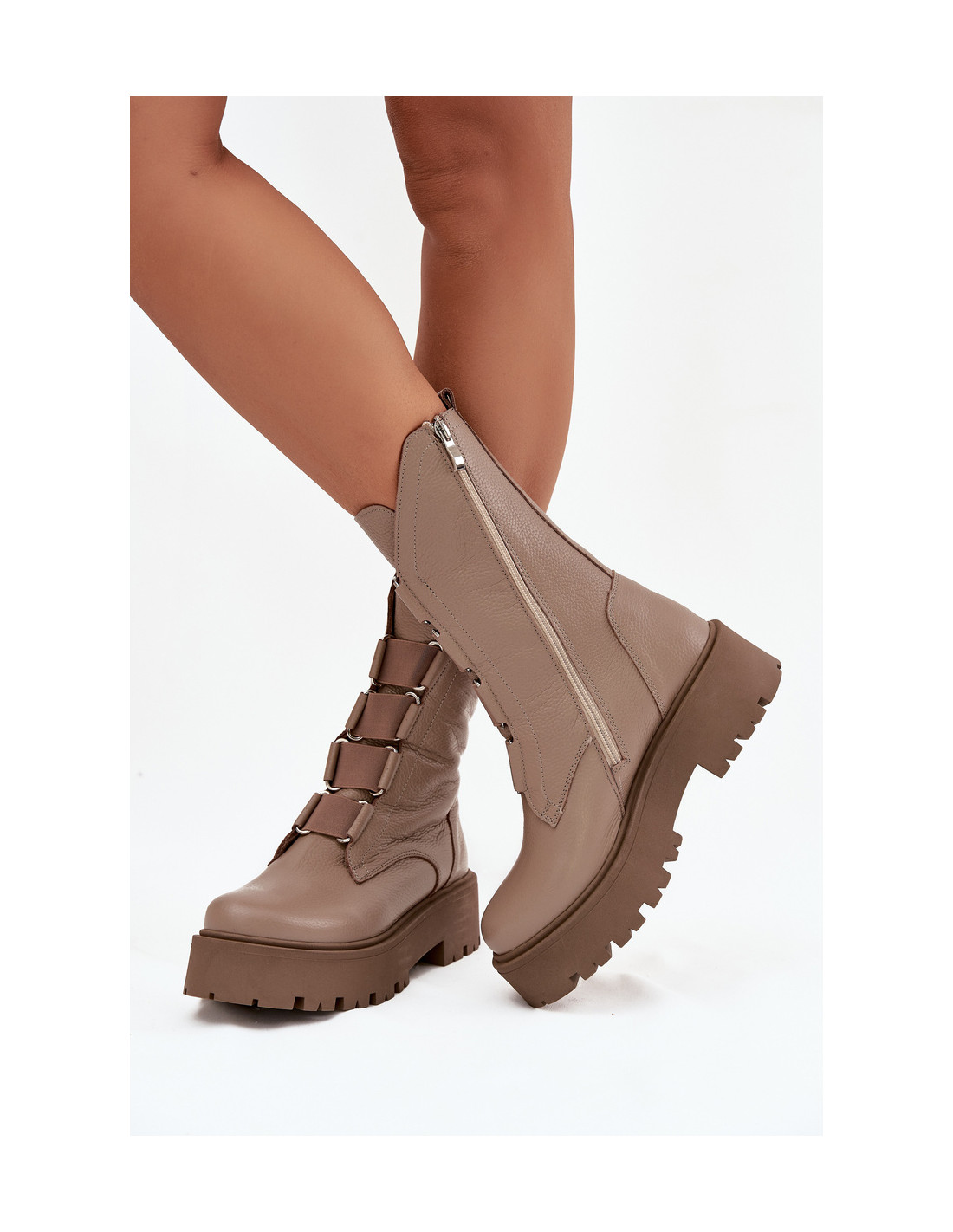 Šie moteriški aulinukai iki kulkšnių, pagaminti iš natūralios odos, derina eleganciją su modernumo prisilietimu. Natūrali oda garantuoja patvarumą, aukštą kokybę ir komfortą, kartu suteikdama stilingą ir nesenstantį įvaizdį. Modelis yra ant tvirtos platformos, kuri ne tik padidina batų aukštį keliais centimetrais, bet ir užtikrina stabilumą bei komfortą kasdienio avėjimo metu. Praktiškas užtrauktukas leidžia juos lengvai apsiauti ir nusiauti, todėl jie yra itin funkcionalūs. Priekyje yra keturios elastinės juostelės, kurios patraukia akį ir atlieka dekoratyvią, ir praktinę funkciją, švelniai pritaikydamos batus prie pėdos ir suteikdamos bendrai išvaizdai modernumo. Šie aulinukai iki kulkšnių puikiai tinka tiek laisvalaikiui, tiek elegantiškesnei aprangai. Rinkdamiesi dydį, vadovaukitės dydžių lentele.