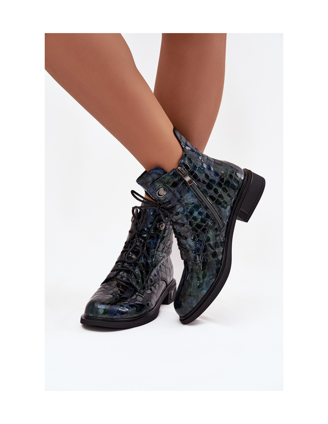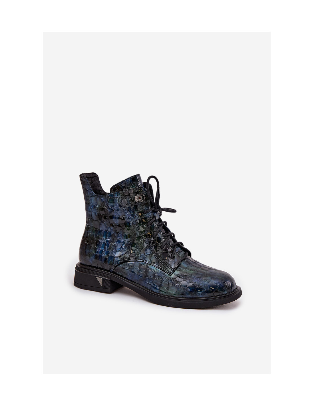 Šie moteriški aulinukai iki kulkšnių, pasiūti iš tikros lakuotos odos, derina eleganciją ir modernų stilių. Blizgi apdaila suteikia jiems unikalumo, o subtilus įspaudas viršutinėje dalyje – išskirtinį charakterį. Šie aulinukai turi raištelių užsegimą ir praktišką užtrauktuką, todėl juos patogu avėti ir jie puikiai priglunda. Subtilus pašiltinimas leidžia jiems puikiai vėsesnėmis dienomis jaustis patogiai ir šiltai. Šis universalus modelis papildys tiek kasdienę aprangą, tiek elegantiškesnius ansamblius. Rinkdamiesi dydį, vadovaukitės dydžių lentele.