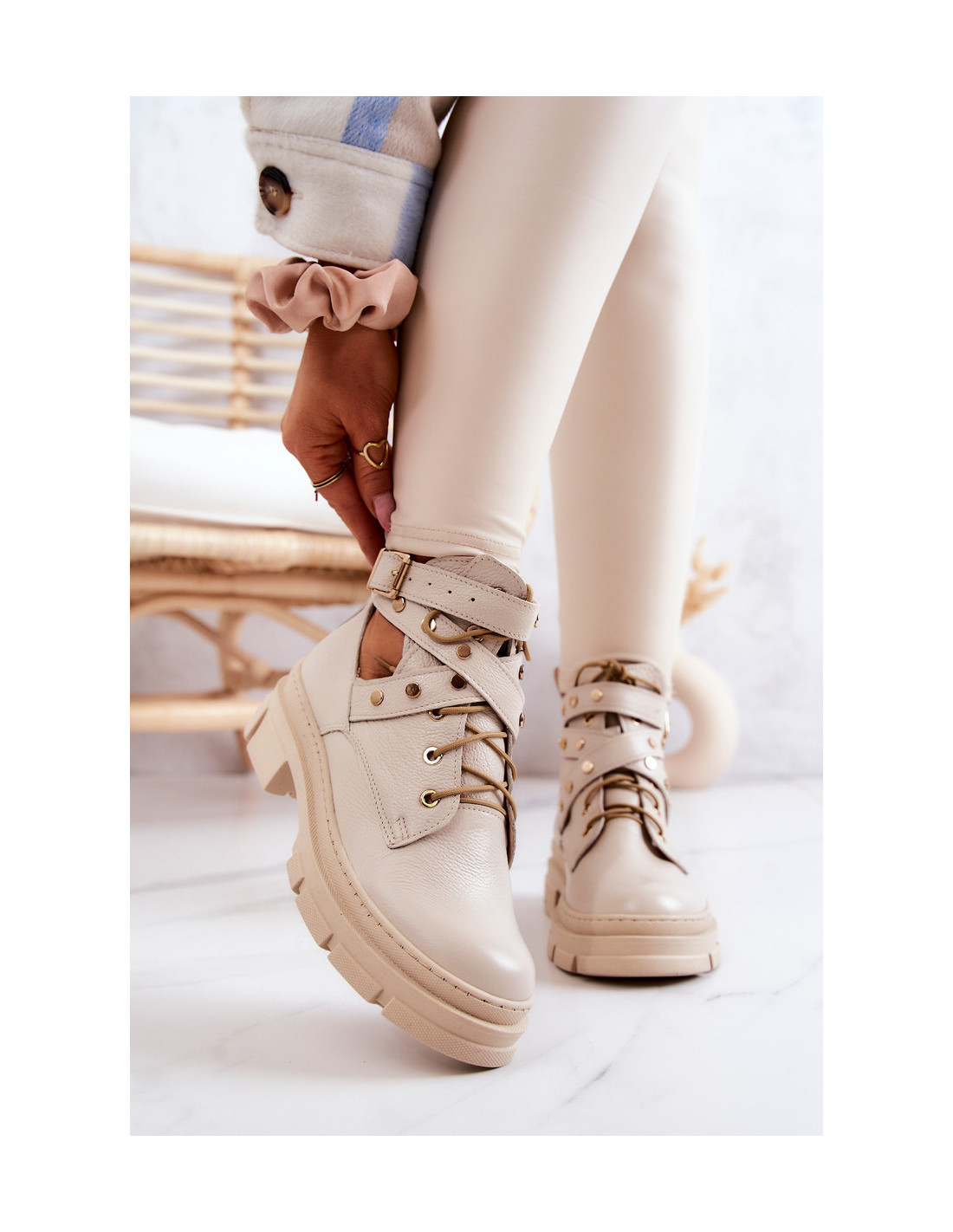 Nuostabūs vasariniai batai iš natūralios odos. Jie turi smeigėmis dekoruotą dirželį, kuris viršutinėje dalyje užsegamas sagtimi. Be to, šie batai turi surišimą, kurio dėka galite tinkamai pritaikyti batus prie kojos pločio. Viršutinės dalies gale yra batų dirželis, ty kilpelė, su kuria galėsite lengviau apsiauti ar nusiauti batus. Batai turi masyvų padą, kuris apsaugo nuo šaltos žemės. Renkantis dydį, naudokite dydžių lentelę.