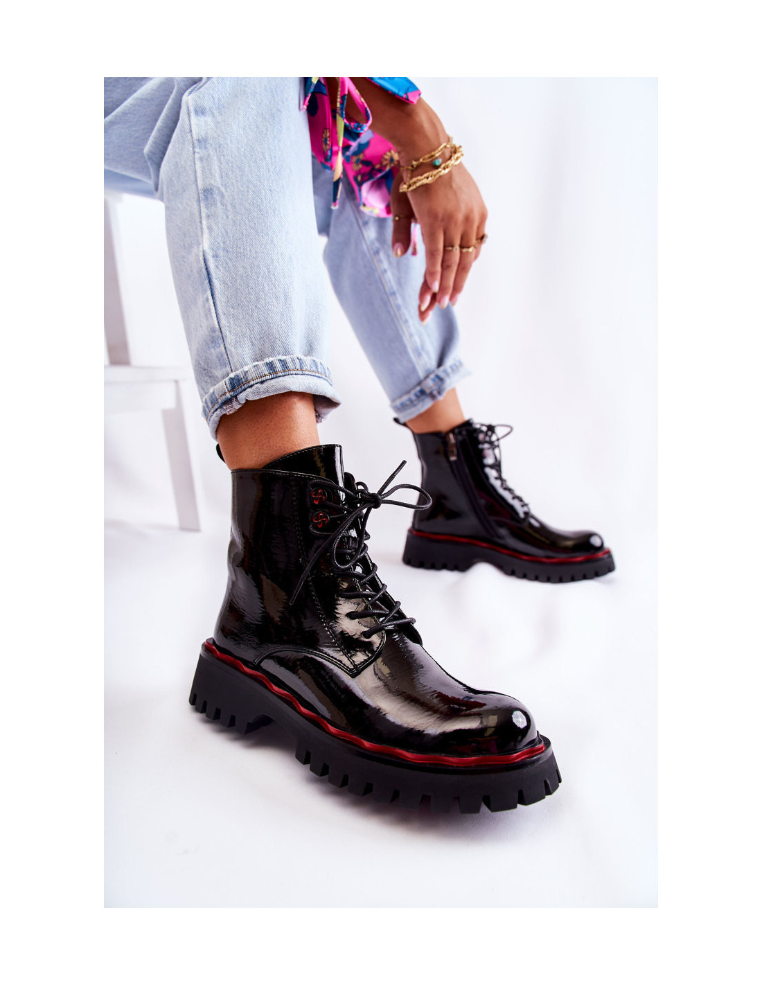 Šie nuostabūs žygio batai gali būti jūsų! Jie buvo pagaminti iš lakuotos eko odos. Jie turi įdomų raštą prie pado. Suvarstomas modelis, užsegamas užtrauktuku. Batai turi standų pakulnį. Vidus ir vidpadis iškloti malonia liesti avalynės antklode. Jie montuojami ant plokščio kulno ir subtilios platformos. Dėl pado griovelių jie puikiai tinka vaikščioti nelygiu reljefu. Renkantis dydį, naudokite dydžių lentelę.