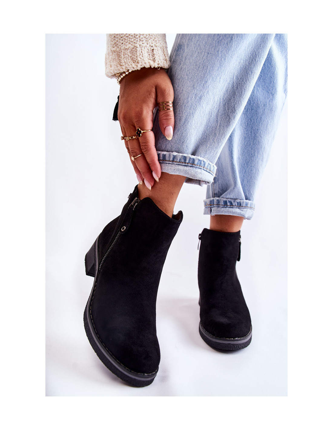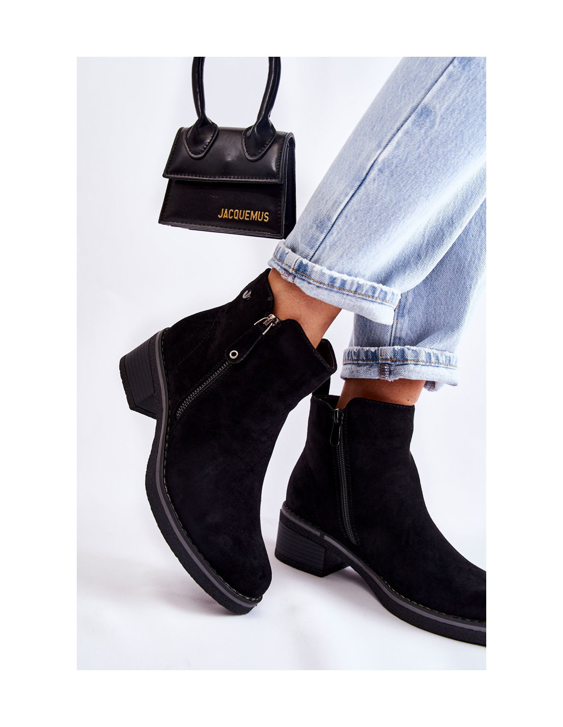 Klasikiniai moteriški batai, tvirtinami ant kulno žemo stulpelio pavidalu. Padas iš guminės medžiagos papildomai neslidus. Modelis turi du slankiklius – vienas iš jų dekoratyvus. Batai pagaminti iš ekologiškos zomšos su kulkšnies viršumi. Jie turi standų kulnų skaitiklį. Viduje jie yra izoliuoti maloniu liesti antklode. Puikus modelis šaltesnėms dienoms! Renkantis dydį, naudokite dydžių lentelę.