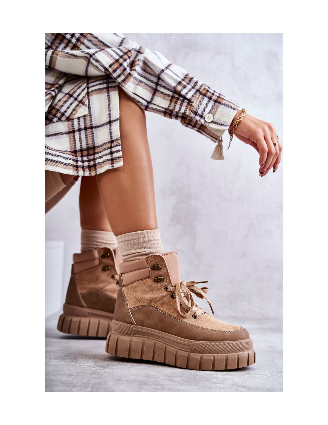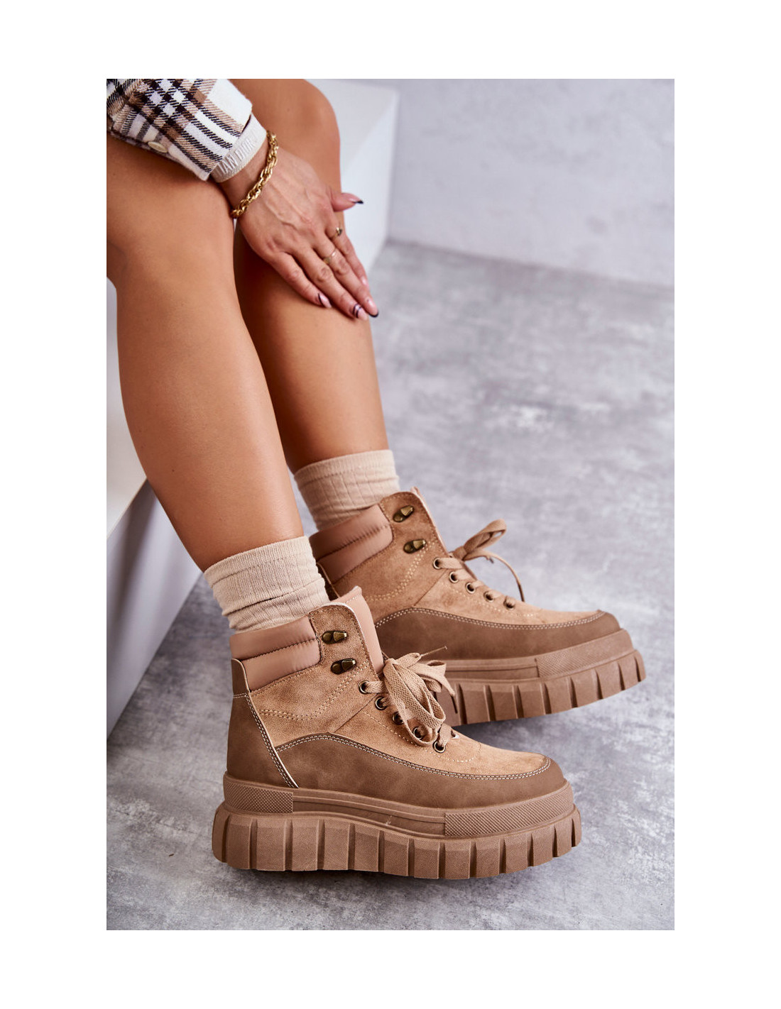 Madingi moteriški batai buvo montuojami ant masyvios platformos, pagamintos iš guminės medžiagos. Jis yra neslidus. Modelis klasikiniu būdu surištas plokščiais raišteliais. Batai pagaminti iš malonaus liesti eko zomšos ir eko odos derinio. Jie turi suapvalintą pirštą. Medžiaginis vidpadis suteiks komforto ir patogumo. Jūs tikrai turėtumėte juos turėti savo drabužių spinta. Renkantis dydį, naudokite dydžių lentelę.