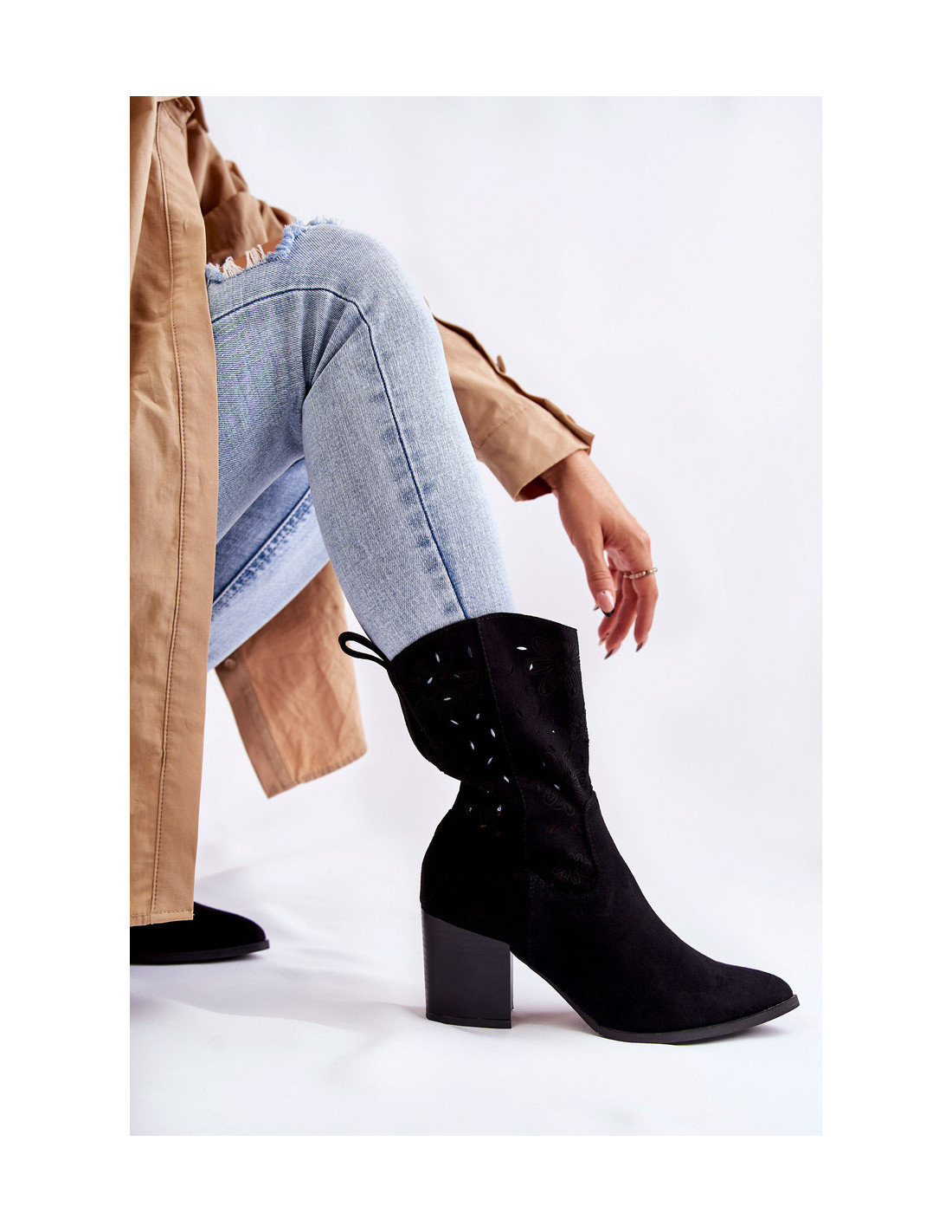 Kaubojiško stiliaus batai tvirtinami ant kulno masyvios stulpelio pavidalu. Viršutinė kulkšnies dalis subtilaus, ažūrinio rašto su gėlių motyvais. Klasikinis modelis su užtrauktuku su būdingu smailia nosimi. Pagaminta iš ekologiškos zomšos. Neapšiltinti jie puikiai tiks pereinamiesiems sezonams. Jie tinka daugeliui stilių, pavyzdžiui, prie kelnių ar boho stiliaus sijonų. Renkantis dydį, naudokite dydžių lentelę.