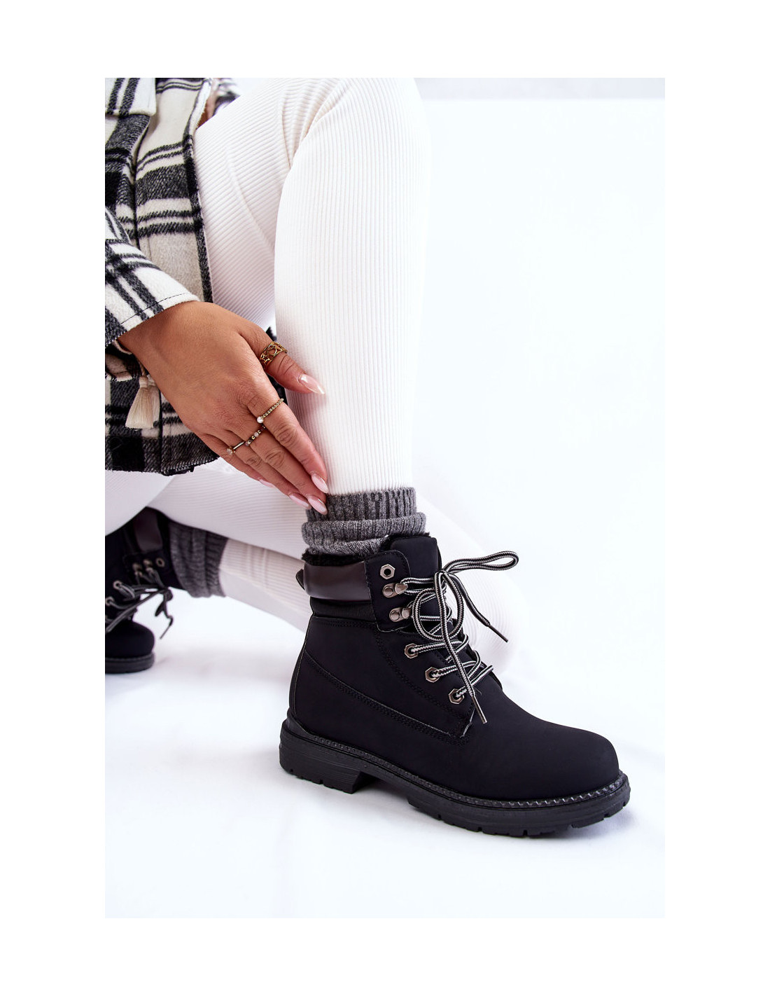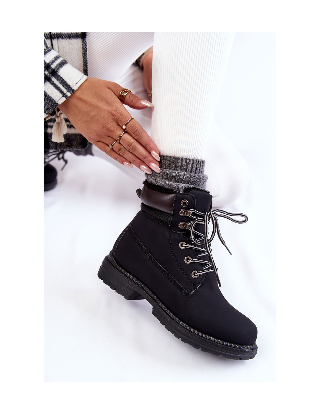 Klasikiniai moteriški žygio batai yra pagaminti iš ekologiškos odos. Jie turi klasikinius raištelius. Modelis montuojamas ant plokščio kulno su subtilia platforma ir grioveliais. Batai buvo izoliuoti storu kailiu. Kulno skaitiklis yra standus. Šis modelis puikiai tiks šaltomis dienomis! Be to, šie batai turi keičiamus putplasčio vidpadžius, padengtus eko oda. Renkantis dydį, naudokite dydžių lentelę.