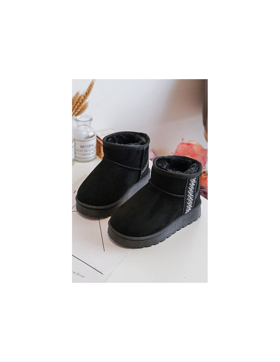 Vaikiški sniego batai su madingu raštu viršutinėje dalyje. Vidus apšiltintas storu sintetiniu kailiuku. Pagaminta iš ekologiškos zomšos. Storas guminis padas apsaugos nuo šaltos žemės. Šis modelis taip pat yra moteriškų dydžių. Sukurkite rinkinį mama + vaikas! Renkantis dydį, vadovaukitės dydžių lentele.
