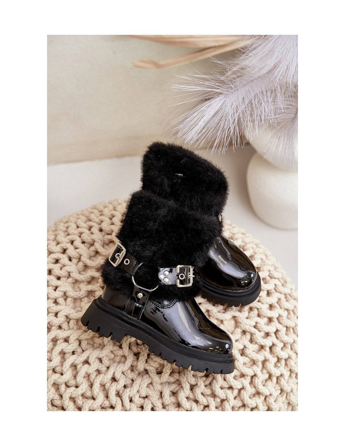 Lakinės odos kulkšnies batai mergaitėms su kailiu ir sagtimis Black Cartemes