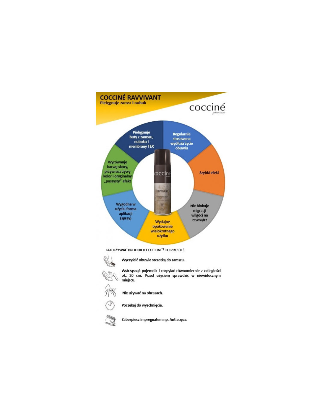 Ravvivant gaivina ir išlygina odos spalvą, atkuria natūralią spalvą ir originalų (purų) nubuko ir zomšos efektą. Neblokuoja drėgmės patekimo į išorę, todėl pėda mažiau prakaituoja. Apsaugo nuo saulės spindulių poveikio odos spalvai.