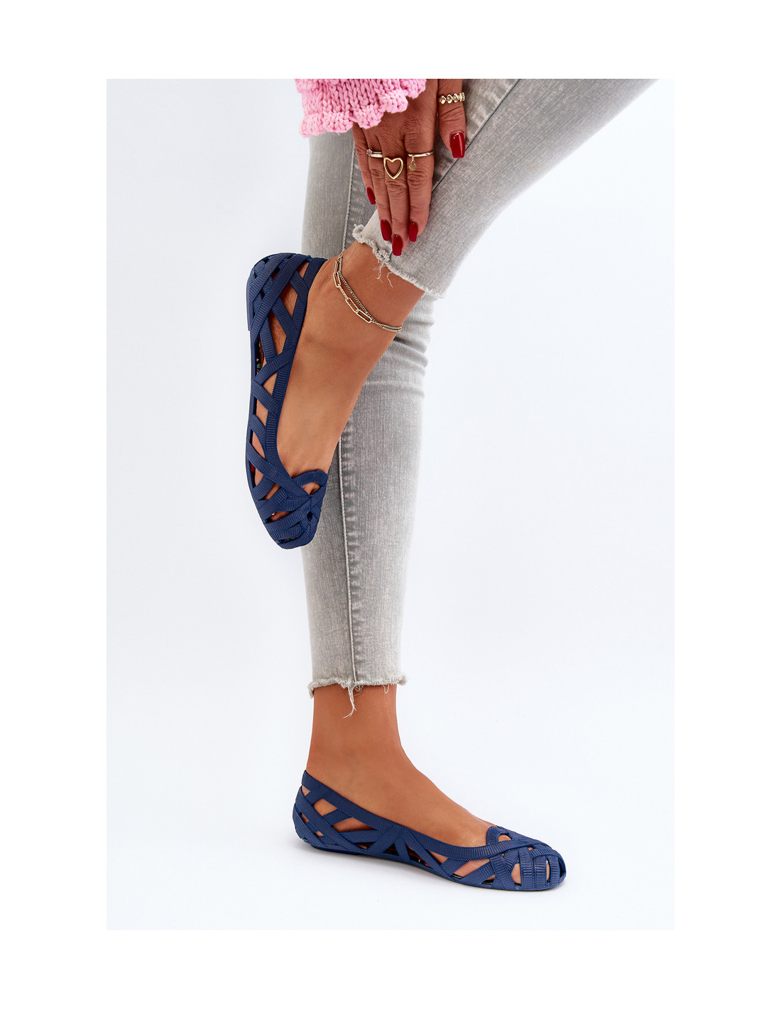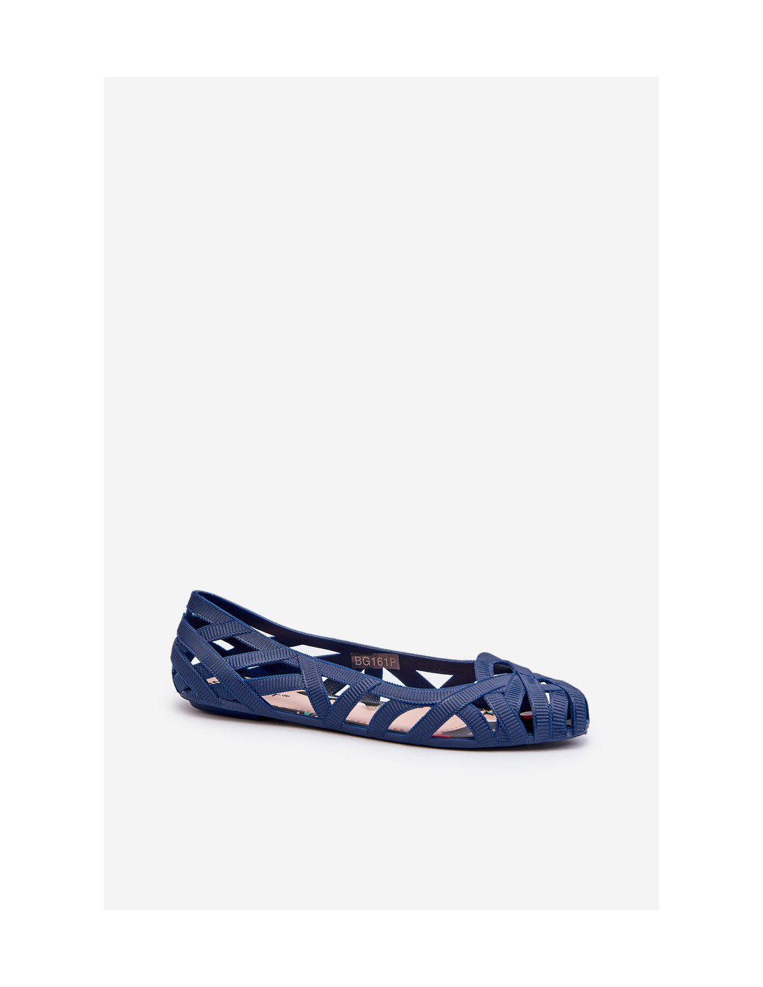 Moteriški balerinų batai pagaminti iš guminės medžiagos. Dekoratyvinis dizainas su persipynusiomis juostelėmis. Baleto butai yra ant plokščio kulno. Migdolo formos nosis. Šis modelis puikiai tinka karštoms dienoms! Renkantis dydį, vadovaukitės dydžių lentele.